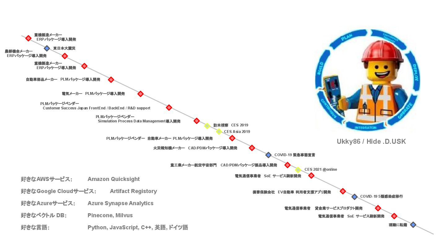 ERPパッケージ導入開発 損害保険会社 EV自動車 利用者支援アプリ開発 電気通信事業者 貸金業サービスプロダクト開発 PLMパッケージベンダー Customer Success Japan FrontEnd / BackEnd / R&D support PLMパッケージベンダー Simulation Process Data Management導入開発 PLMパッケージベンダー 自動車メーカー PLMパッケージ導入開発 重工業メーカー航空宇宙部門 CAD/PDMパッケージ製品導入開発 COVID-19 緊急事態宣言 COVID-19 5類感染症移行 訪米視察 CES 2019 好きなAWSサービス: Amazon Quicksight 好きなGoogle Cloudサービス: Artifact Registory 好きなAzureサービス: Azure Synapse Analytics 好きなベクトル DB: Pinecone, Milvus 好きな言語: Python, JavaScript, C++, 英語, ドイツ語 CES Asia 2019 CES 2021 @online Ukky86 / Hide .D.USK 電気通信事業者 SoE サービス刷新開発 現職に転籍 農耕機会メーカー ERPパッケージ導入開発 東日本大震災 重機製造メーカー ERPパッケージ導入開発