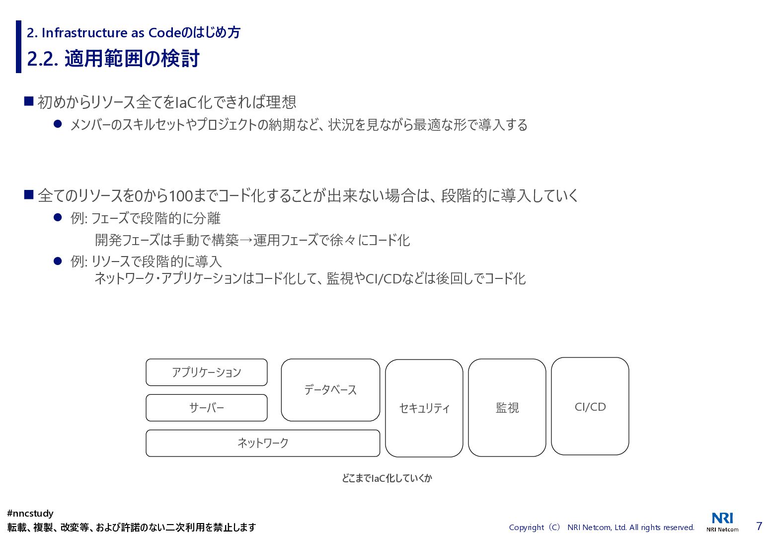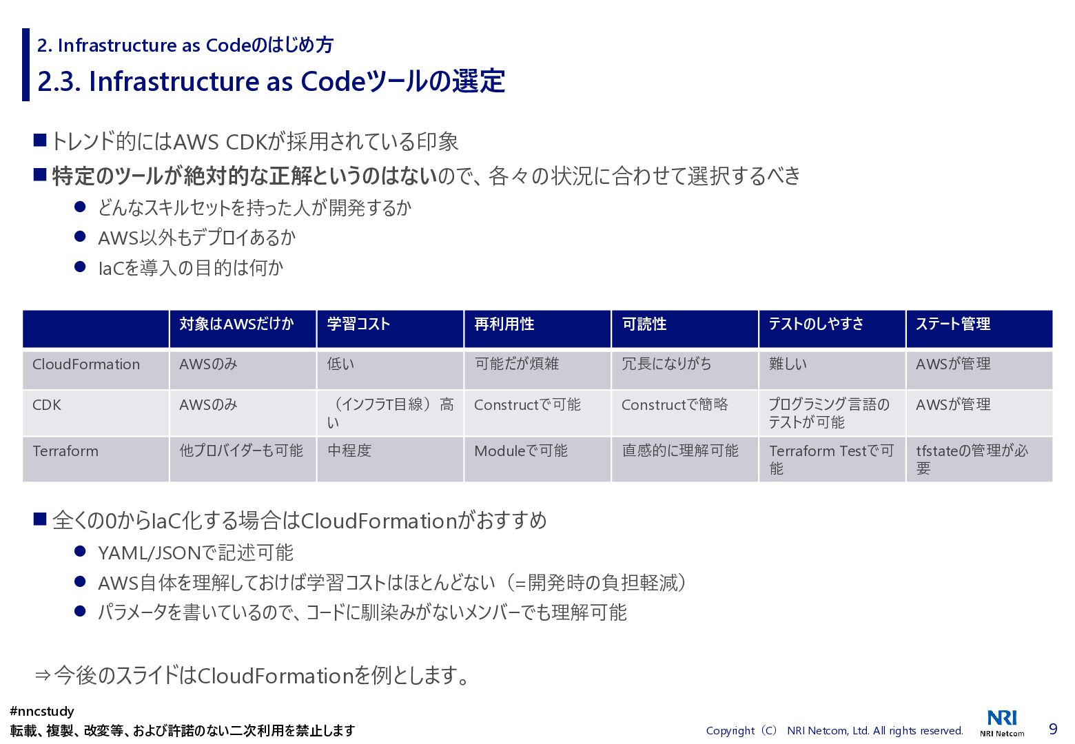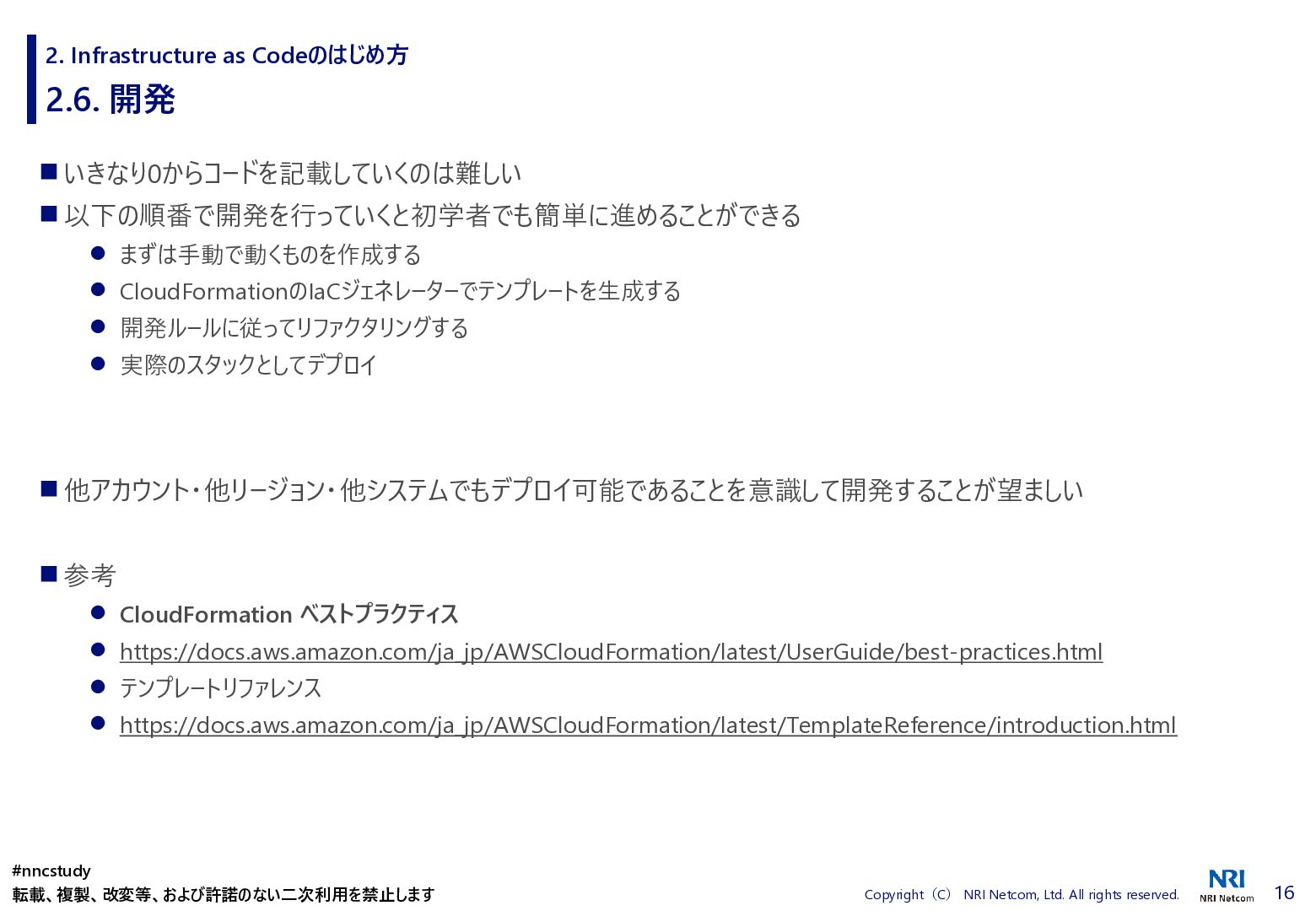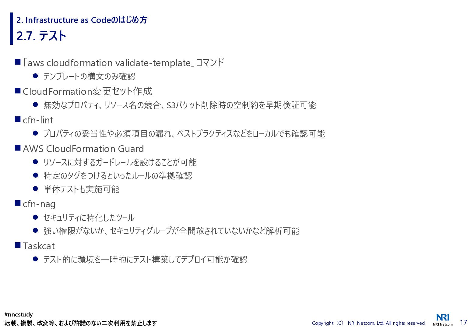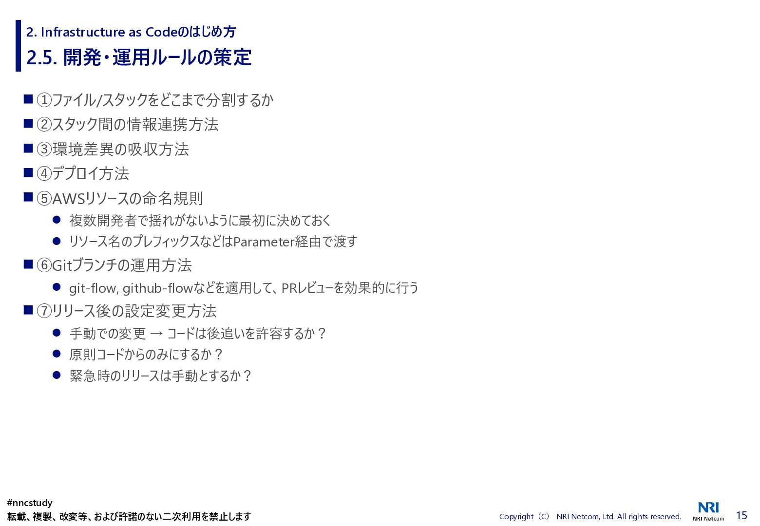 ◼ ①ファイル/スタックをどこまで分割するか ◼ ②スタック間の情報連携方法 ◼ ③環境差異の吸収方法 ◼ ④デプロイ方法 ◼ ⑤AWSリソースの命名規則 ⚫ 複数開発者で揺れがないように最初に決めておく ⚫ リソース名のプレフィックスなどはParameter経由で渡す ◼ ⑥Gitブランチの運用方法 ⚫ git-flow, github-flowなどを適用して、PRレビューを効果的に行う ◼ ⑦リリース後の設定変更方法 ⚫ 手動での変更 → コードは後追いを許容するか? ⚫ 原則コードからのみにするか? ⚫ 緊急時のリリースは手動とするか? 2. Infrastructure as Codeのはじめ方 #nncstudy 転載、複製、改変等、および許諾のない二次利用を禁止します