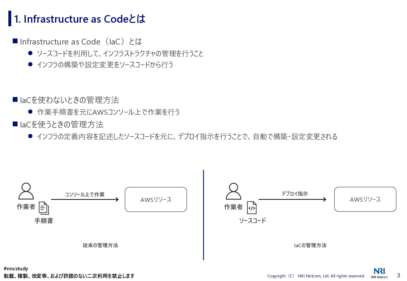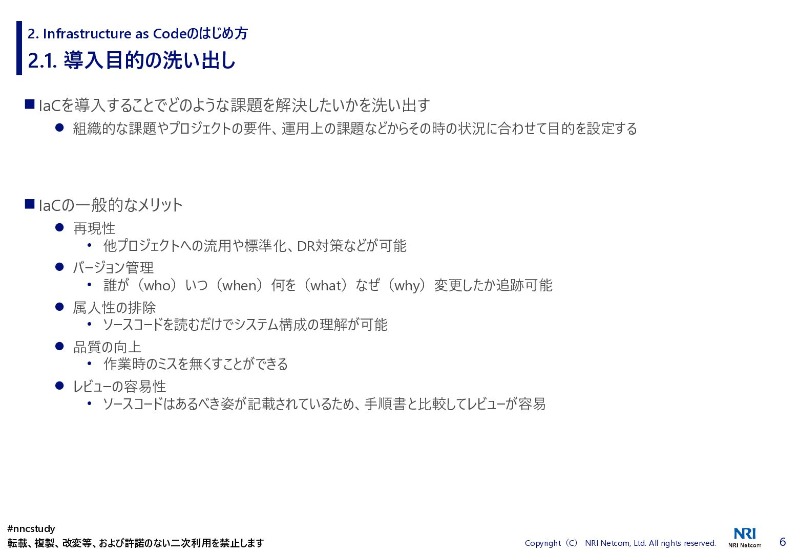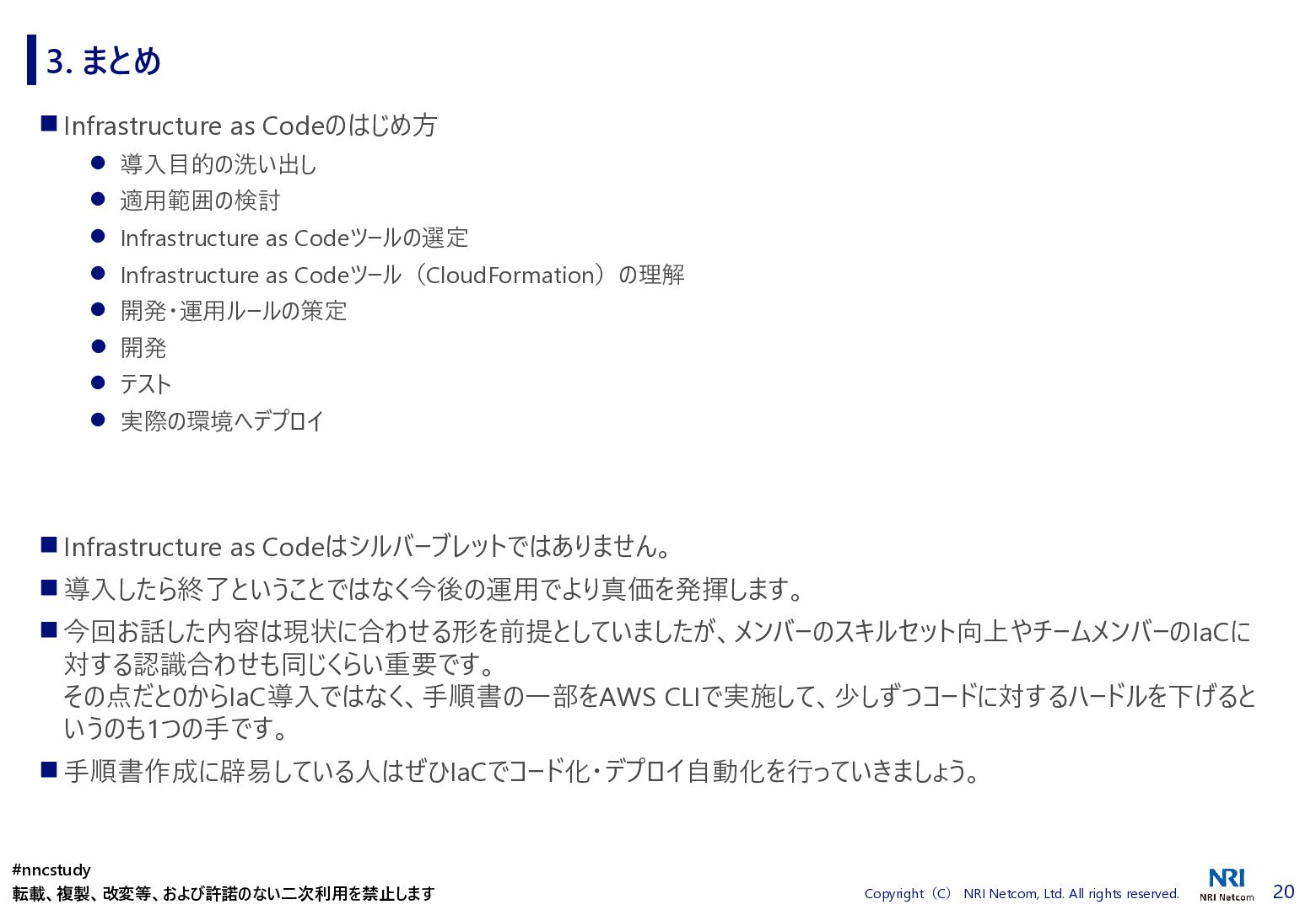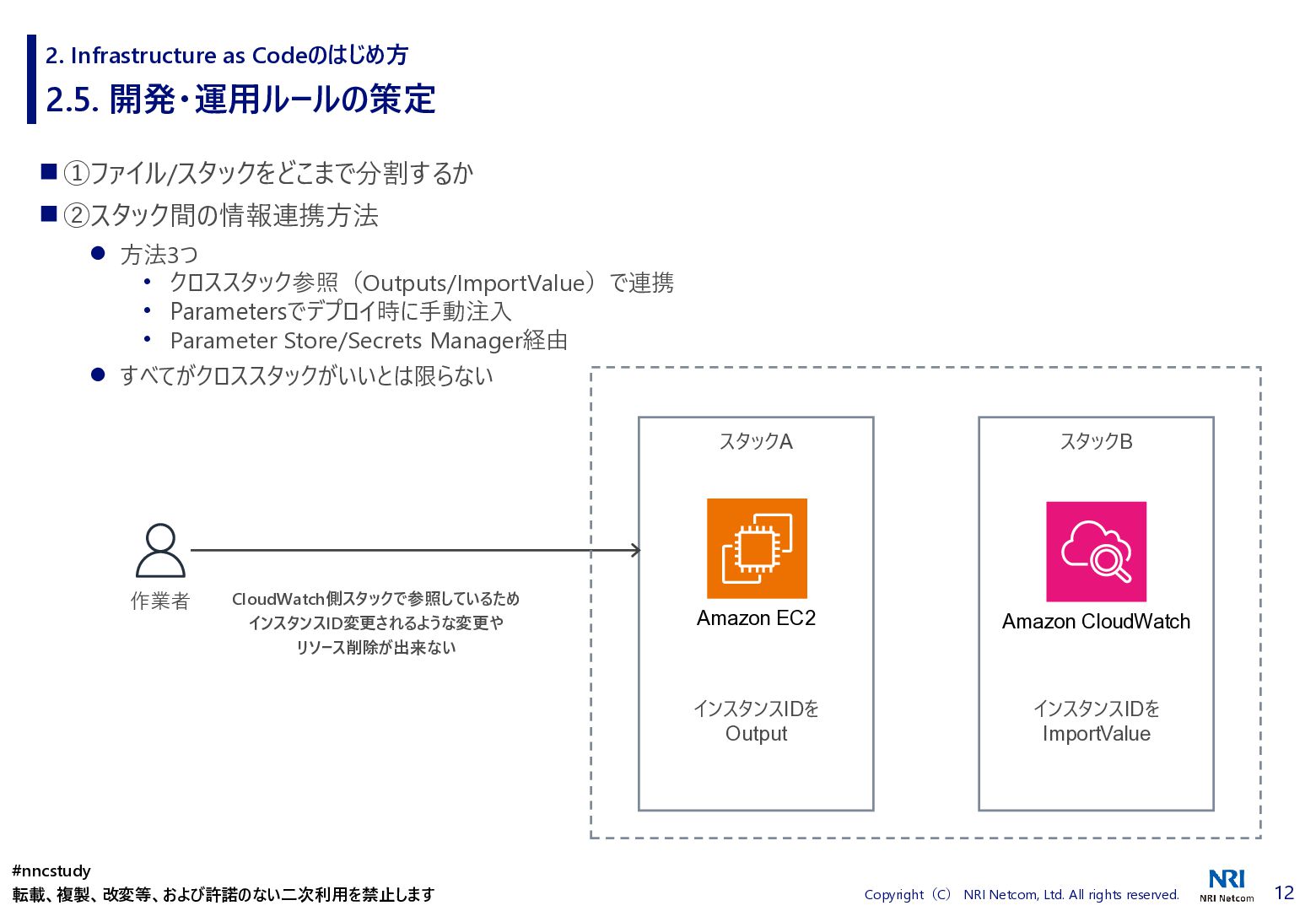◼ ①ファイル/スタックをどこまで分割するか ◼ ②スタック間の情報連携方法 ◼ ③環境差異の吸収方法 ◼ ④デプロイ方法 ◼ ⑤AWSリソースの命名規則 ⚫ 複数開発者で揺れがないように最初に決めておく ⚫ リソース名のプレフィックスなどはParameter経由で渡す ◼ ⑥Gitブランチの運用方法 ⚫ git-flow, github-flowなどを適用して、PRレビューを効果的に行う ◼ ⑦リリース後の設定変更方法 ⚫ 手動での変更 → コードは後追いを許容するか? ⚫ 原則コードからのみにするか? ⚫ 緊急時のリリースは手動とするか? 2. Infrastructure as Codeのはじめ方 #nncstudy 転載、複製、改変等、および許諾のない二次利用を禁止します