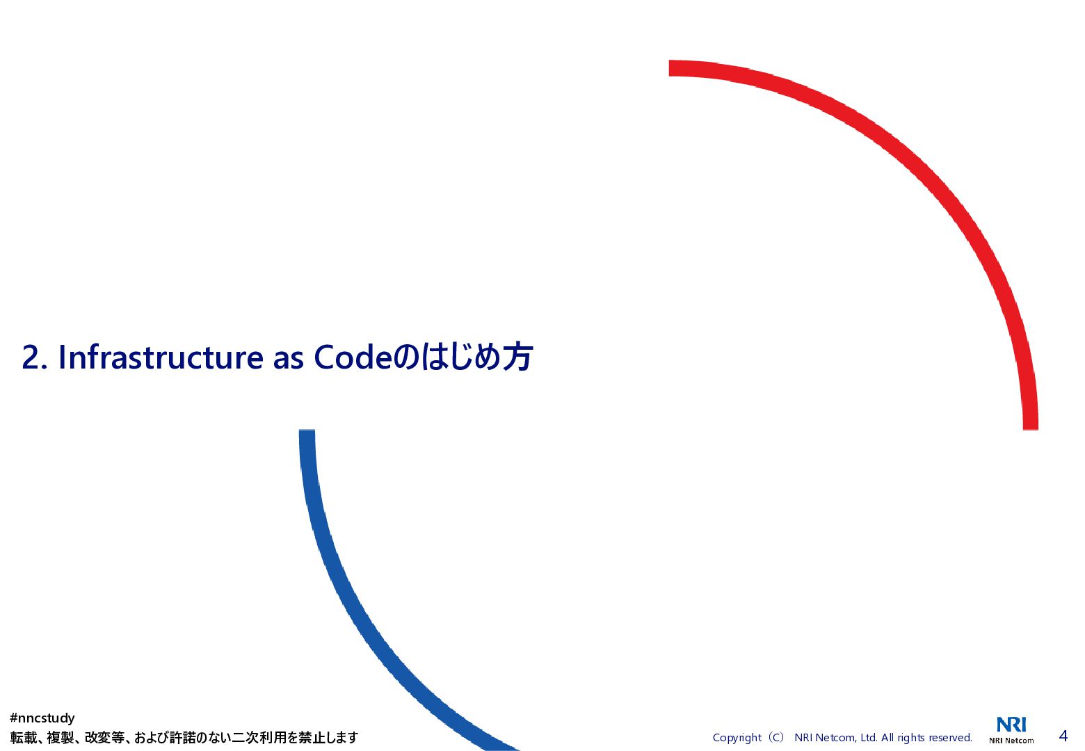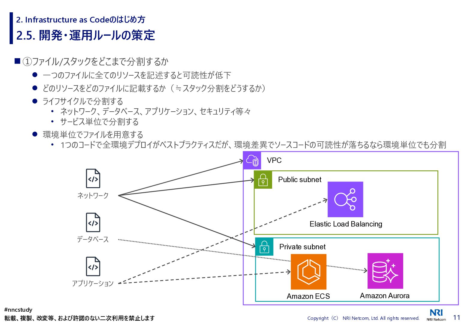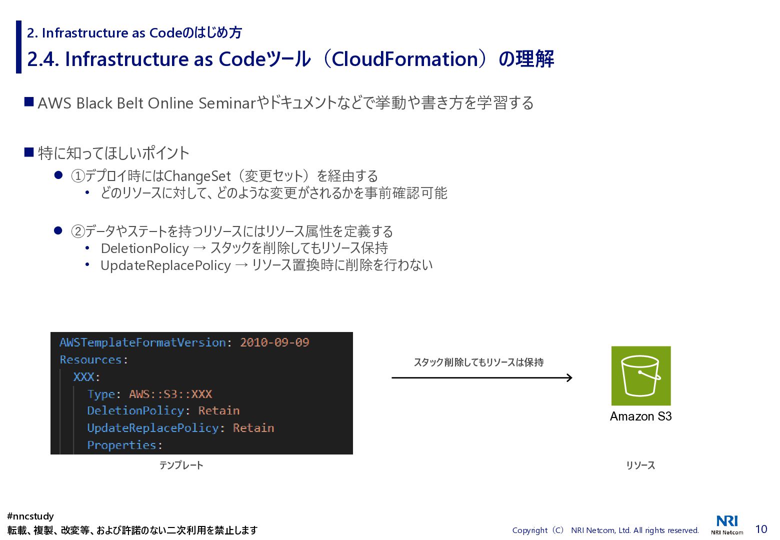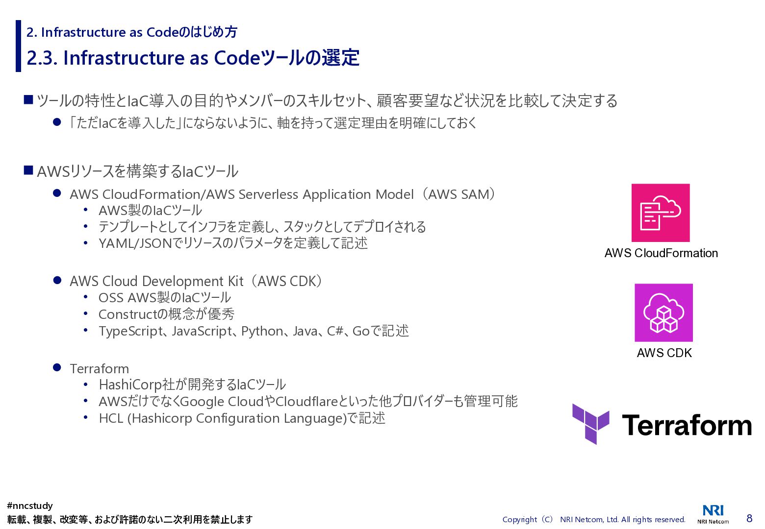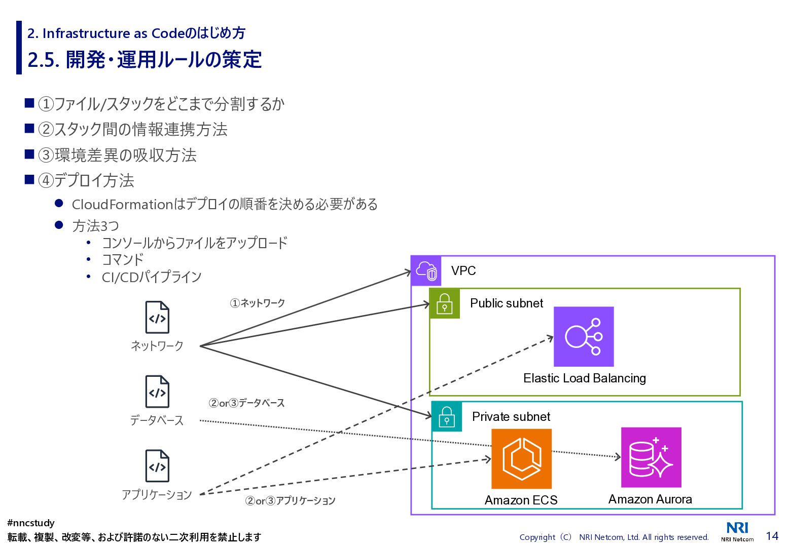 ◼ ①ファイル/スタックをどこまで分割するか ◼ ②スタック間の情報連携方法 ◼ ③環境差異の吸収方法 ◼ ④デプロイ方法 ◼ ⑤AWSリソースの命名規則 ⚫ 複数開発者で揺れがないように最初に決めておく ⚫ リソース名のプレフィックスなどはParameter経由で渡す ◼ ⑥Gitブランチの運用方法 ⚫ git-flow, github-flowなどを適用して、PRレビューを効果的に行う ◼ ⑦リリース後の設定変更方法 ⚫ 手動での変更 → コードは後追いを許容するか? ⚫ 原則コードからのみにするか? ⚫ 緊急時のリリースは手動とするか? 2. Infrastructure as Codeのはじめ方 #nncstudy 転載、複製、改変等、および許諾のない二次利用を禁止します