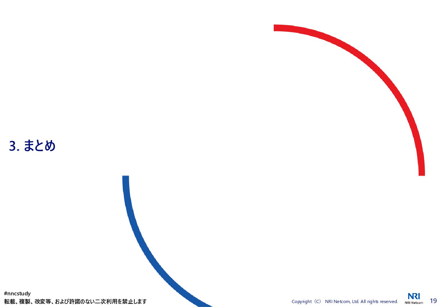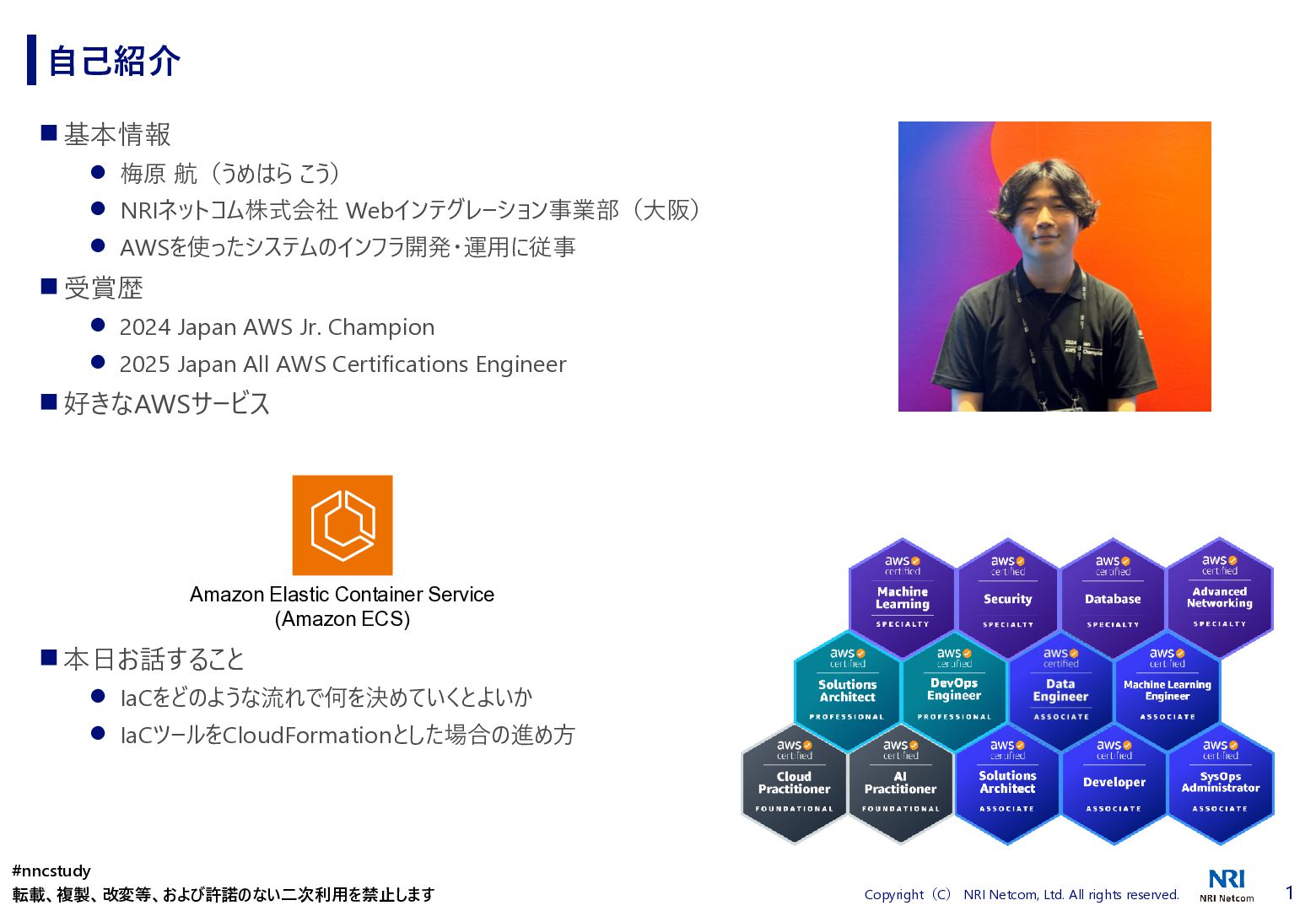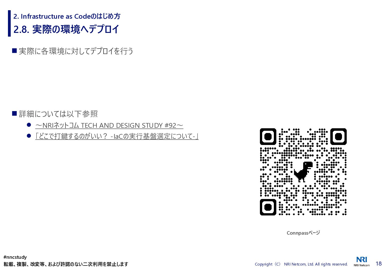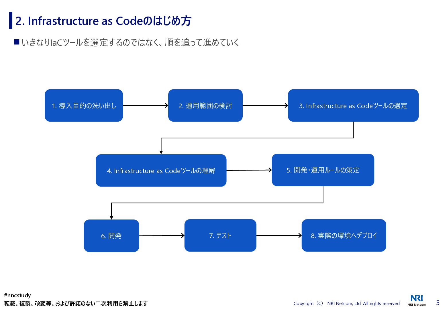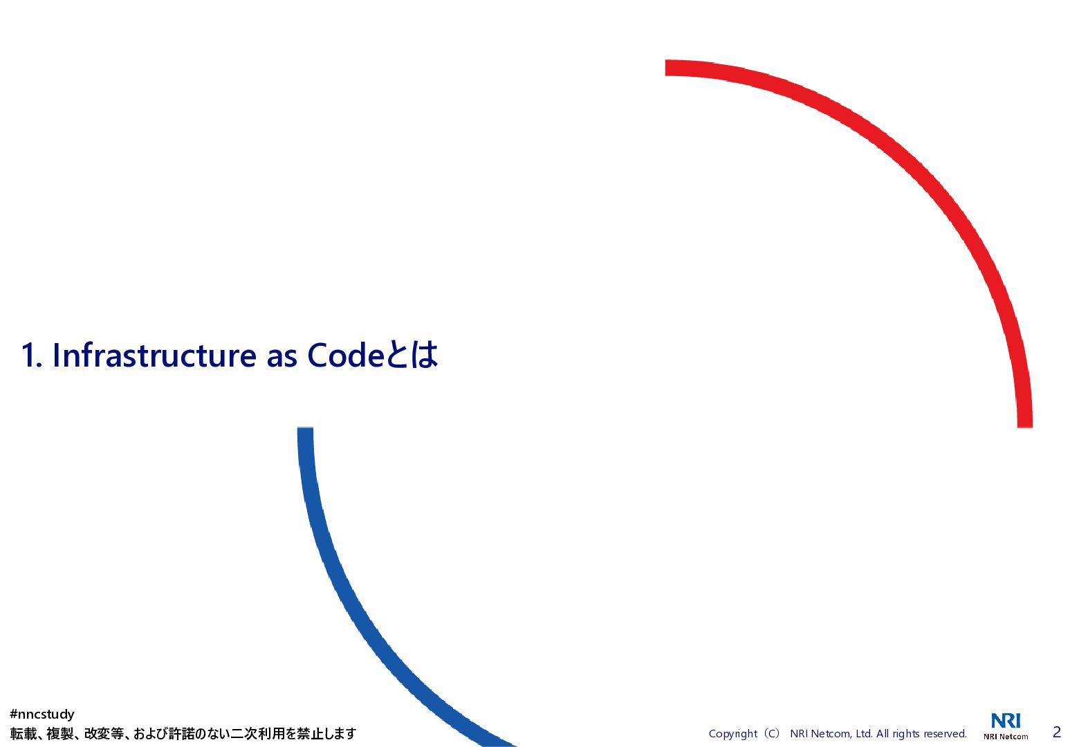 ◼ ①ファイル/スタックをどこまで分割するか ◼ ②スタック間の情報連携方法 ◼ ③環境差異の吸収方法 ◼ ④デプロイ方法 ◼ ⑤AWSリソースの命名規則 ⚫ 複数開発者で揺れがないように最初に決めておく ⚫ リソース名のプレフィックスなどはParameter経由で渡す ◼ ⑥Gitブランチの運用方法 ⚫ git-flow, github-flowなどを適用して、PRレビューを効果的に行う ◼ ⑦リリース後の設定変更方法 ⚫ 手動での変更 → コードは後追いを許容するか? ⚫ 原則コードからのみにするか? ⚫ 緊急時のリリースは手動とするか? 2. Infrastructure as Codeのはじめ方 #nncstudy 転載、複製、改変等、および許諾のない二次利用を禁止します