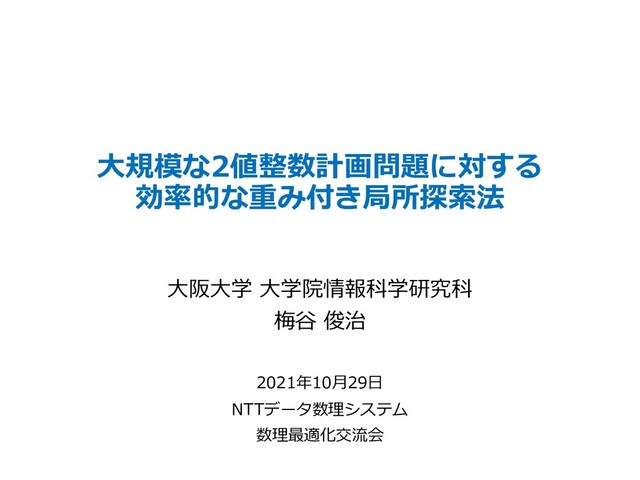 search algorithm in large-scale set partitioning problems, Proc. of 29th AAAI Conference on Artificial Intelligence (AAAI-15), 1226-1232. • S.Umetani, Exploiting variable associations to configure efficient local search algorithm in large-scale binary integer programs, European Journal of Operational Research, 263 (2017), 72-81. (open access) 28