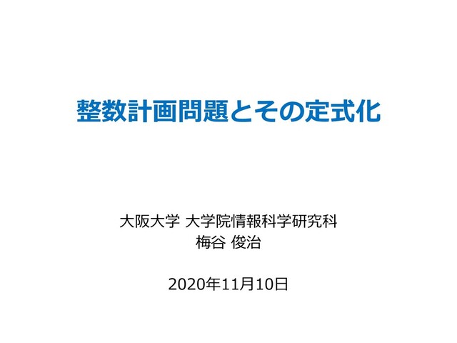 整数計画問題を解くソルバーの進歩は著しく「15年間で100万倍⾼速化した」 といわれる.この100万倍の内訳は,ハードウェアの⾼速化で1000倍,アル ゴリズムの⾼速化で1000倍である.この数字は数年前に⾔われていたもので あり,現在では「20年間で1000万倍(=3000倍×3000倍)」と⾔っても過⾔ ではない. (中略) どのぐらいの規模の問題を解けるのだろうか︖⼀概に⾔うことはできないが, 個⼈的には以下のような感覚を持っている. ü 変数が1000個未満︓何も考えずにソルバーで解かせる. ü 変数が5000固程度︓おそらく解ける. ü 変数が10000個程度︓最適性の証明が難しいこともある. ü 変数が50000個程度︓問題が簡単なら解ける. 個⼈⽤PCを利⽤ 整数計画問題の難しさは必ずしも⼊⼒サイズに⽐例しないので,⼩規模でも極めて難問であるという事 例は少なくない.