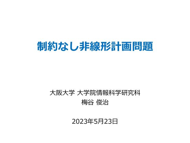 非線形計画問題は,おもに非線形関数で表された目的関数や制約条件を含む連続最適化問題であり,適用範囲が非常に広い一方で,多様な非線形計画問題を効率的に解く汎用的なアルゴリズムを開発することは難しい.今回は,効率的に解ける非線形計画問題の特徴を説明した後に,制約なし非線形計画問題の最適性の条件および代表的なアルゴリズムを紹介する.