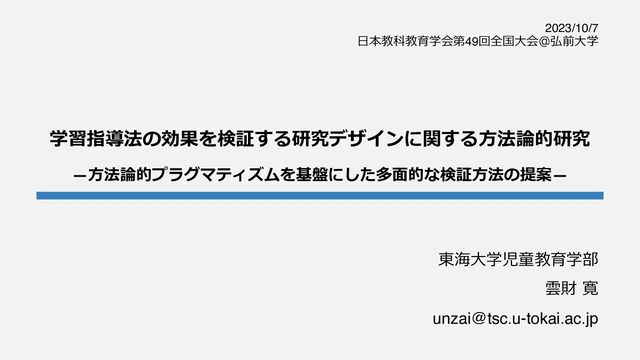 学習指導法の効果を検証する研究デザインに関する⽅法論的研究 ―⽅法論的プラグマティズムを基盤にした多⾯的な検証⽅法の提案― 東海⼤学児童教育学部 雲財 寛