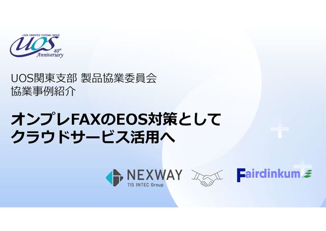 オンプレのFAXサーバーから通信回線経由で送信していたFAX原稿を「WilComm」を利用して電子帳票化後、 既存のメール環境を利用してクラウドへ連携、クラウド側でメール受信後は直ちに指定された宛先にFAX送信が行われます。 業務繫忙時であっても潤沢な通信回線が利用でき、送信遅延を最小化、従量課金制のサービスのため送信にかかるコストの最適化も期待できます。 さらに、完全二重化されたサービス基盤はシステム障害や広域災害などの際「お客様の業務を止めない」運用基盤を提供します。 協業の効果 従来、FAX不達時の原因解明など、通信機器・回線環境にまで踏み込んだリカバリー対応がシステム運用の負担となっていたが、 通信事業者としてサービス提供されるクラウドサービスのサポート利用が出来ることで大幅な負荷軽減が実現できた。 FNX e-帳票FAXサービス(イメージ入力タイプ) 対象サーバー:IBM i/AS400システム V5.4~ ソフトウェア:WilComm Mail Kit P05 ¥600,000/税別(印刷機能ぬき) フォームデザイナー ¥100,000/税別 導入設定および操作トレーニング: ¥420,000~(※個別見積) ※ソフトウェア保守:ライセンス15%/年 初期加入料:なし 基本料/月: , PDF閲覧機能利用/月:FAX料金:円/枚~ ※月間の想定発信枚数(総数)に応じた個別料金設定となります。 株式会社ネクスウェイ 〒135-0061 東京都江東区豊洲2丁目2番1号 豊洲ベイサイドクロスタワー 03-6887-1115 Mail: