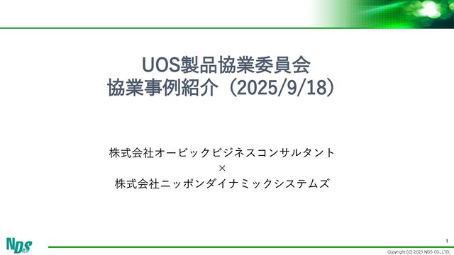 Copyright (C) 2025 NDS CO.,LTD. 1 UOS製品協業委員会 協業事例紹介(2025/9/18) 株式会社オービックビジネスコンサルタント ×
