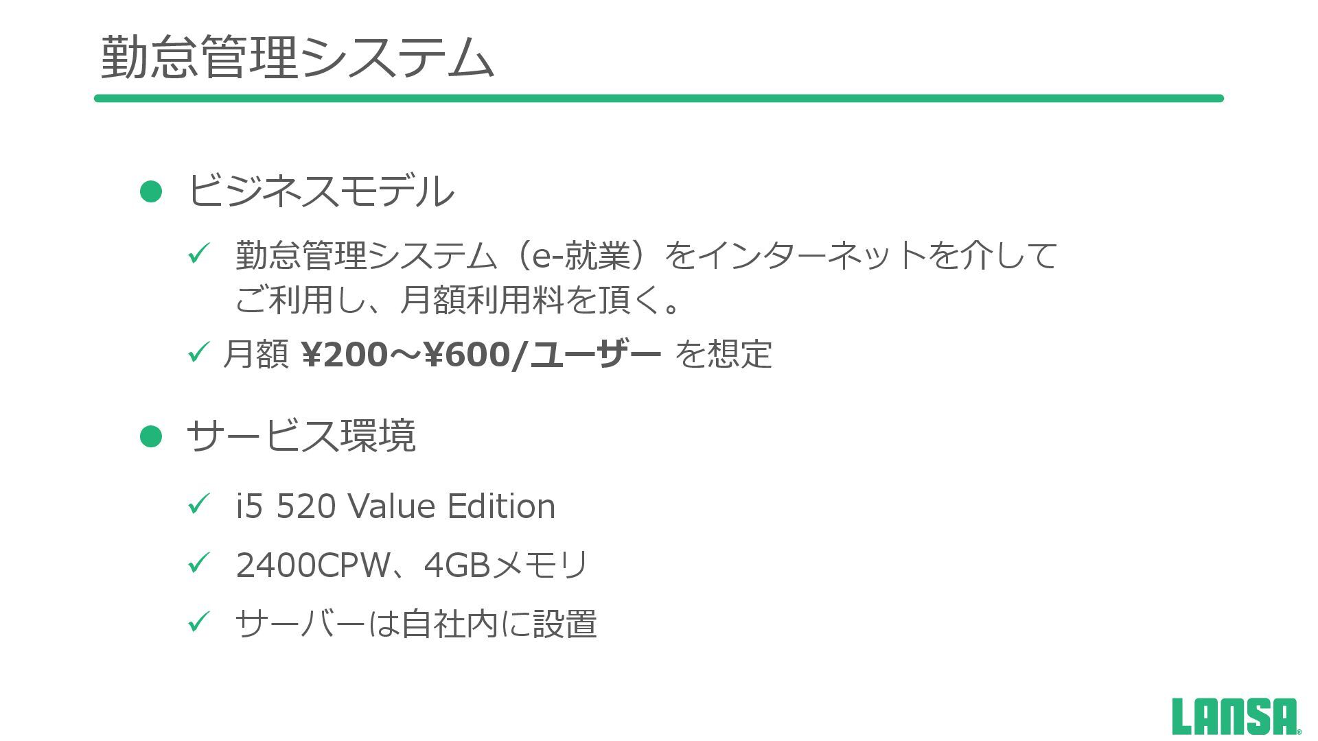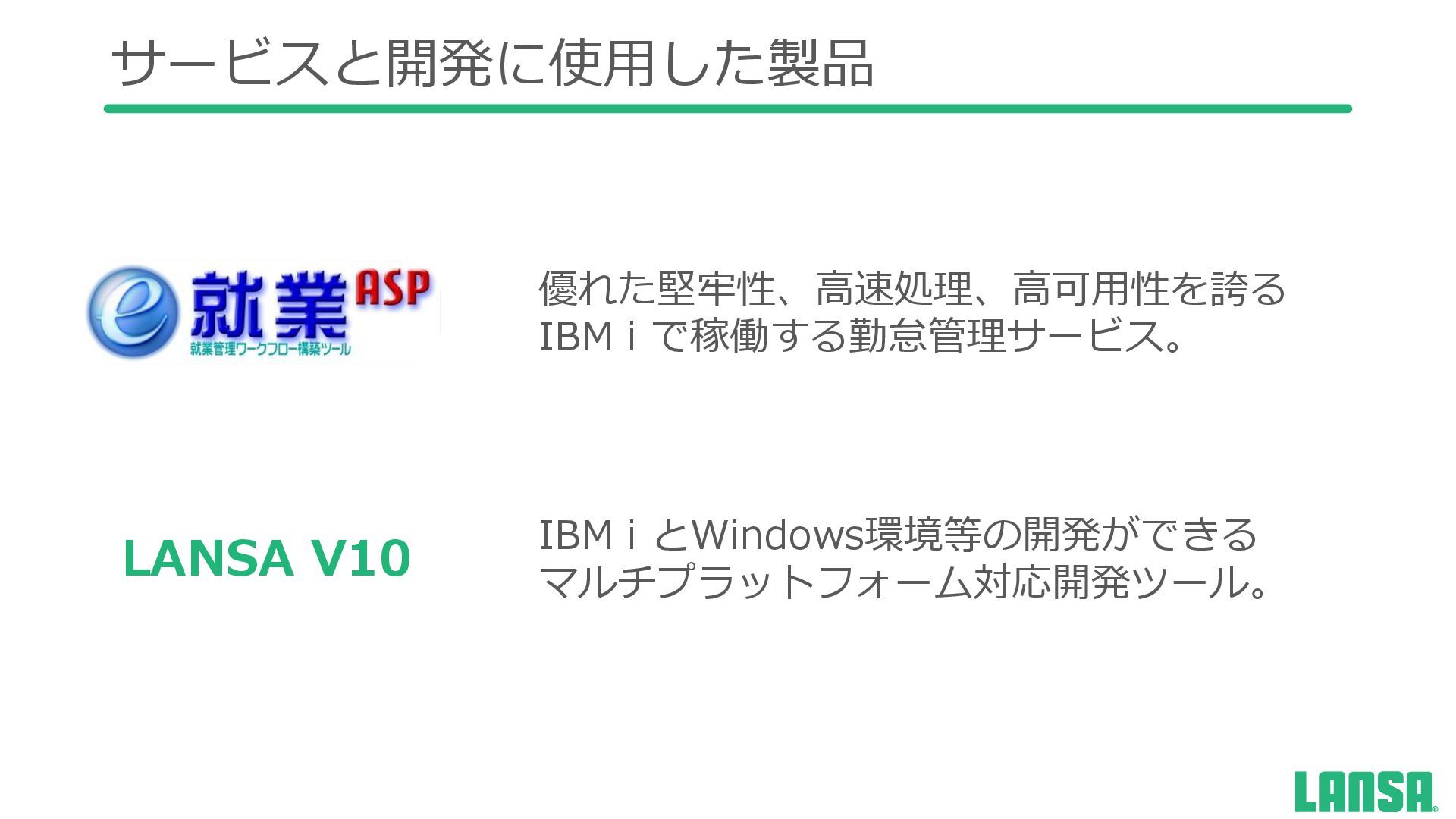 サービスと開発に使用した製品 優れた堅牢性、高速処理、高可用性を誇る IBM i で稼働する勤怠管理サービス。 IBM i とWindows環境等の開発ができる マルチプラットフォーム対応開発ツール。 LANSA