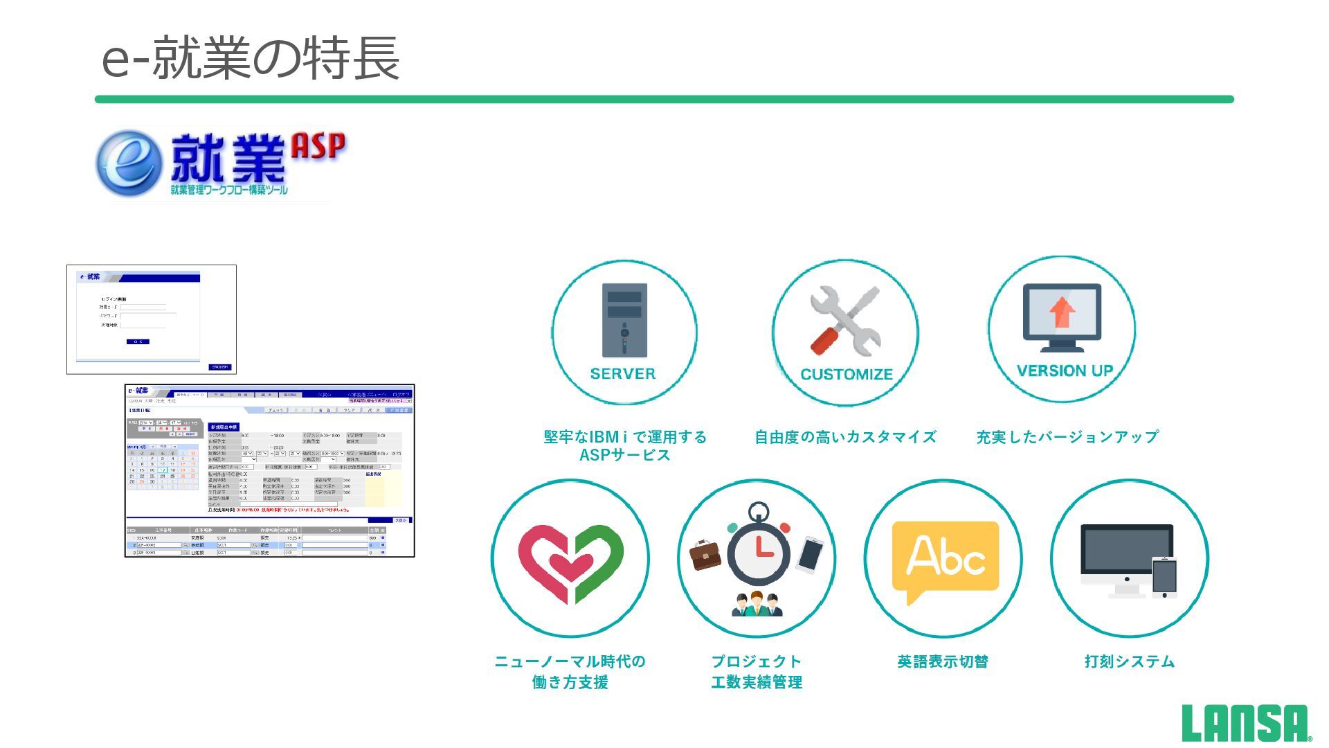 e-就業の特長 堅牢なIBM i で運用する ASPサービス 自由度の高いカスタマイズ 充実したバージョンアップ
