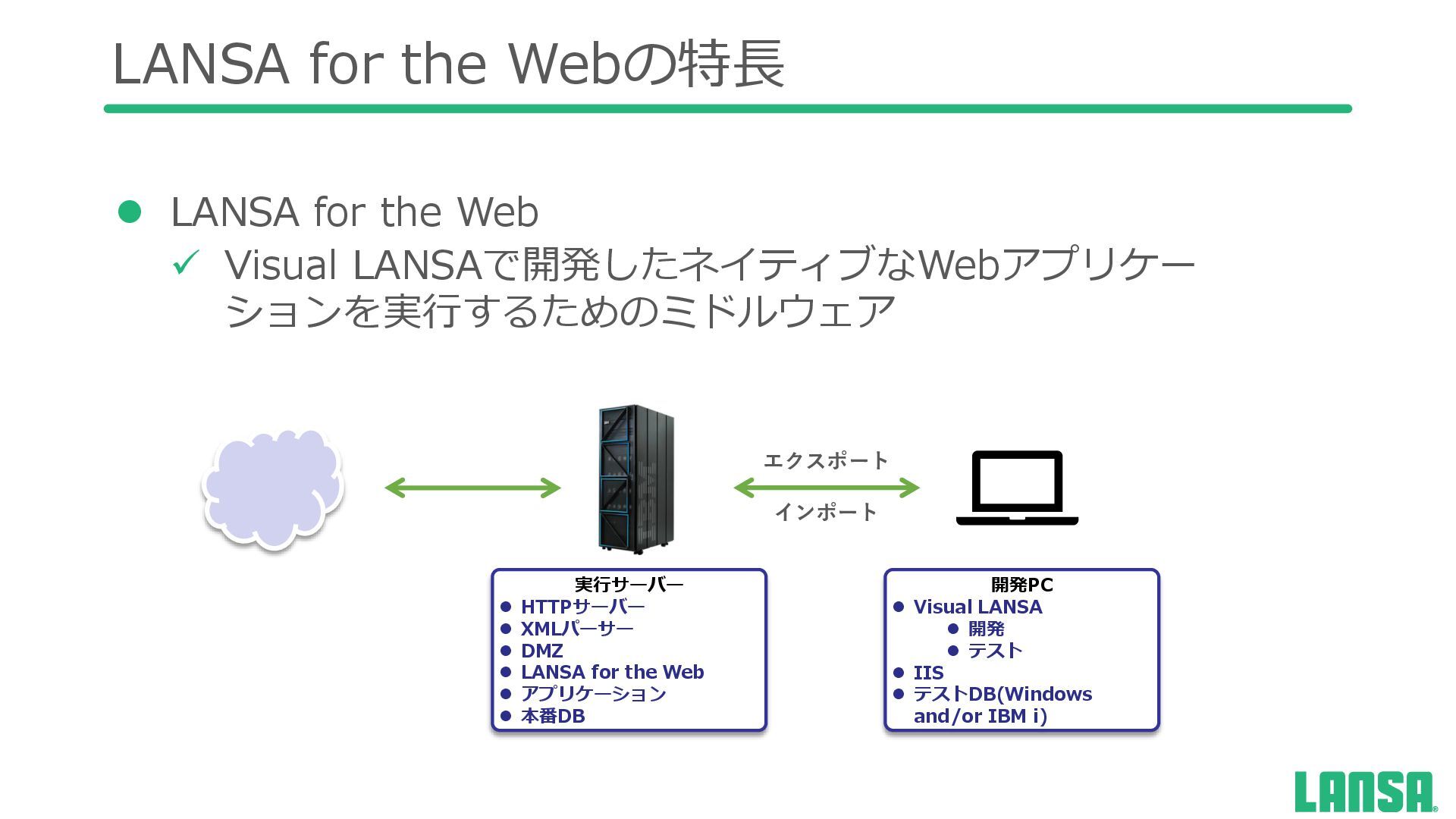 Web ✓ Visual LANSAで開発したネイティブなWebアプリケー ションを実行するためのミドルウェア 実行サーバー ⚫ HTTPサーバー ⚫ XMLパーサー ⚫ DMZ ⚫ LANSA for the Web ⚫ アプリケーション ⚫ 本番DB 開発PC ⚫ Visual LANSA ⚫ 開発 ⚫ テスト ⚫ IIS ⚫ テストDB(Windows and/or IBM i)