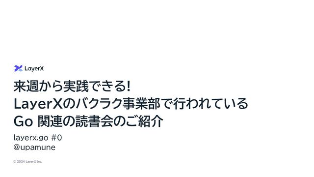 「読書」するのが目的ではなく、これをきっかけに社内のコードではどうかなど、ディスカッションするの が目的 - 読書会後は、みんなの自由研究が始まったりしている - unsafe.String() はどうやって実装されている? - ハマりやすい罠として紹介されているものでlinterを探す、作る? - MarshalJSON() を実装した構造体が複数埋め込まれていたらどうなる? LayerXで実践中の「ゆるい輪読会」をご紹介します 📖 Goの技術書読書会 チームを超えたGoにまつわるナレッジ共有