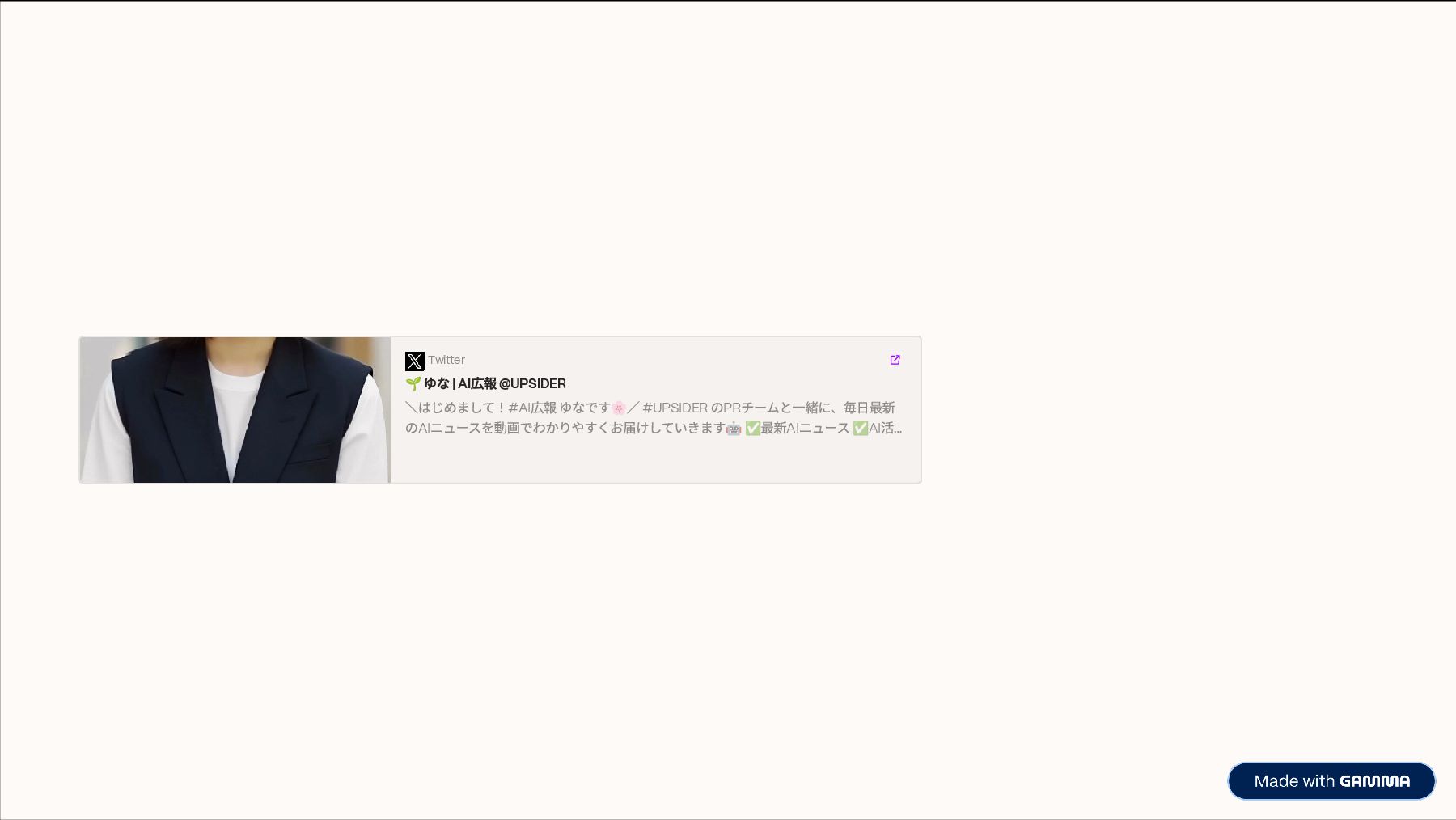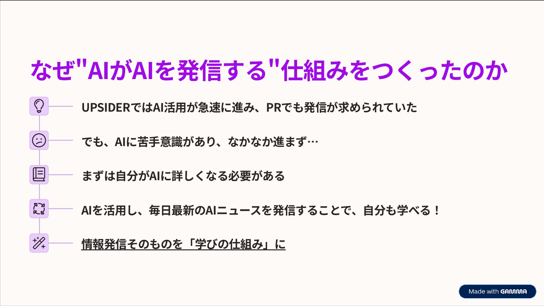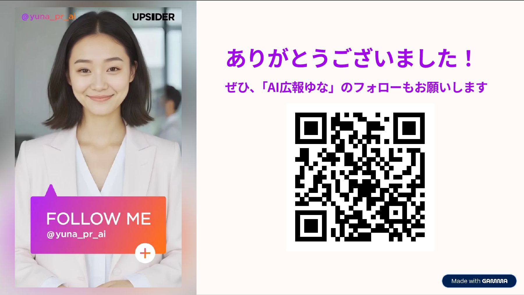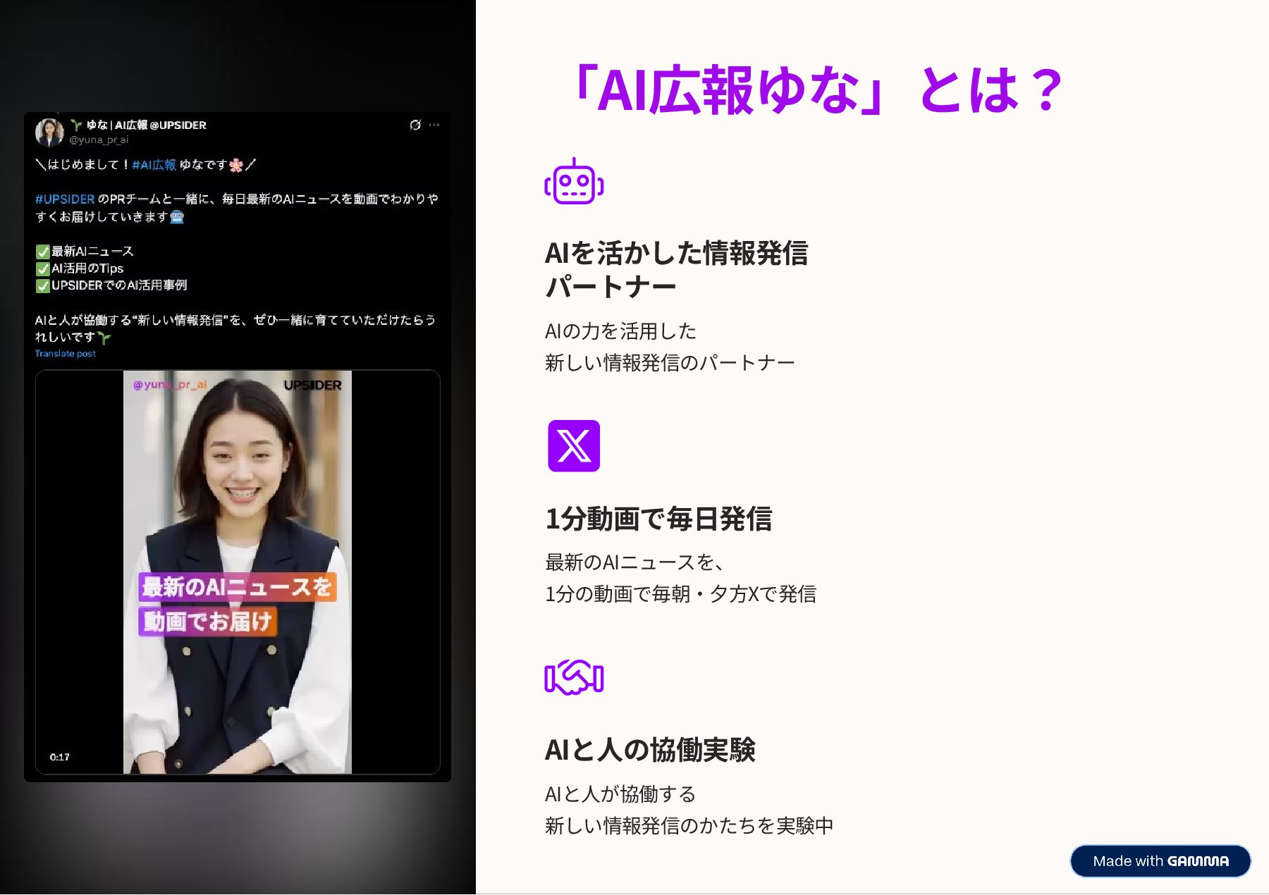 UPSIDER PRチームのAI活用取り組み「AI広報ゆな」についてのスライドです。