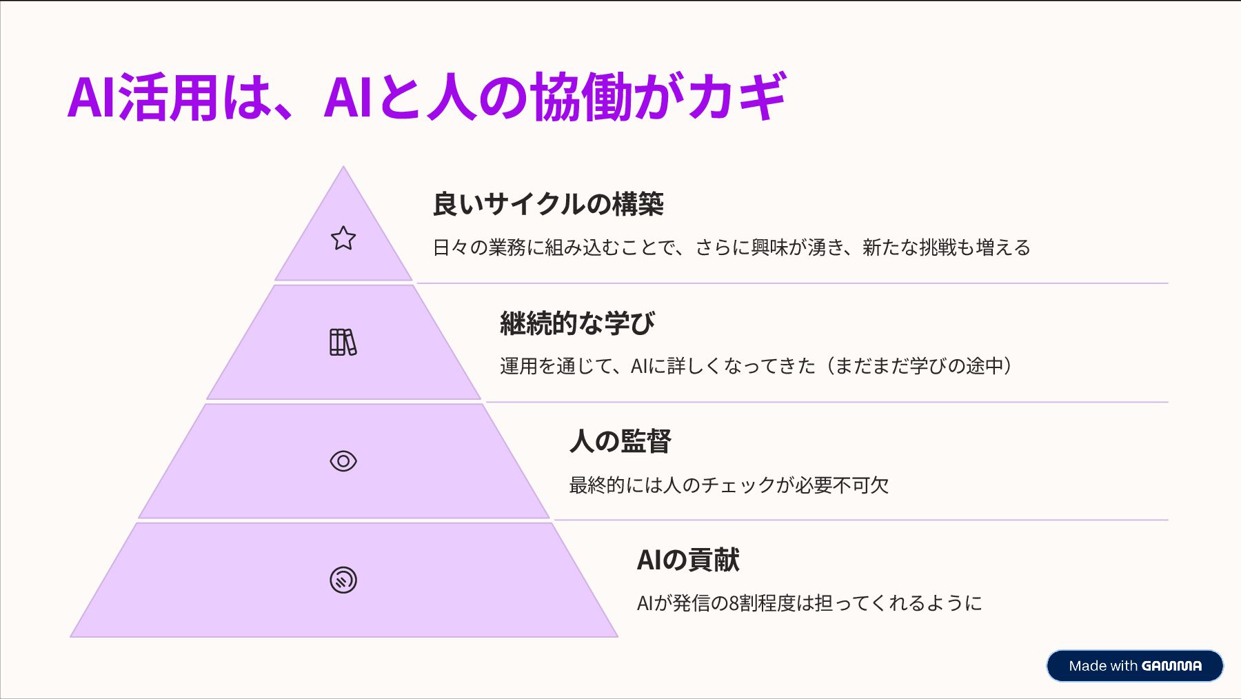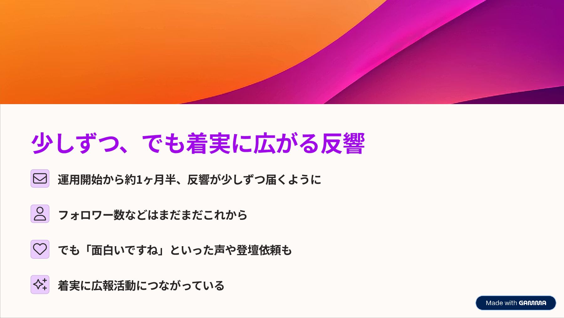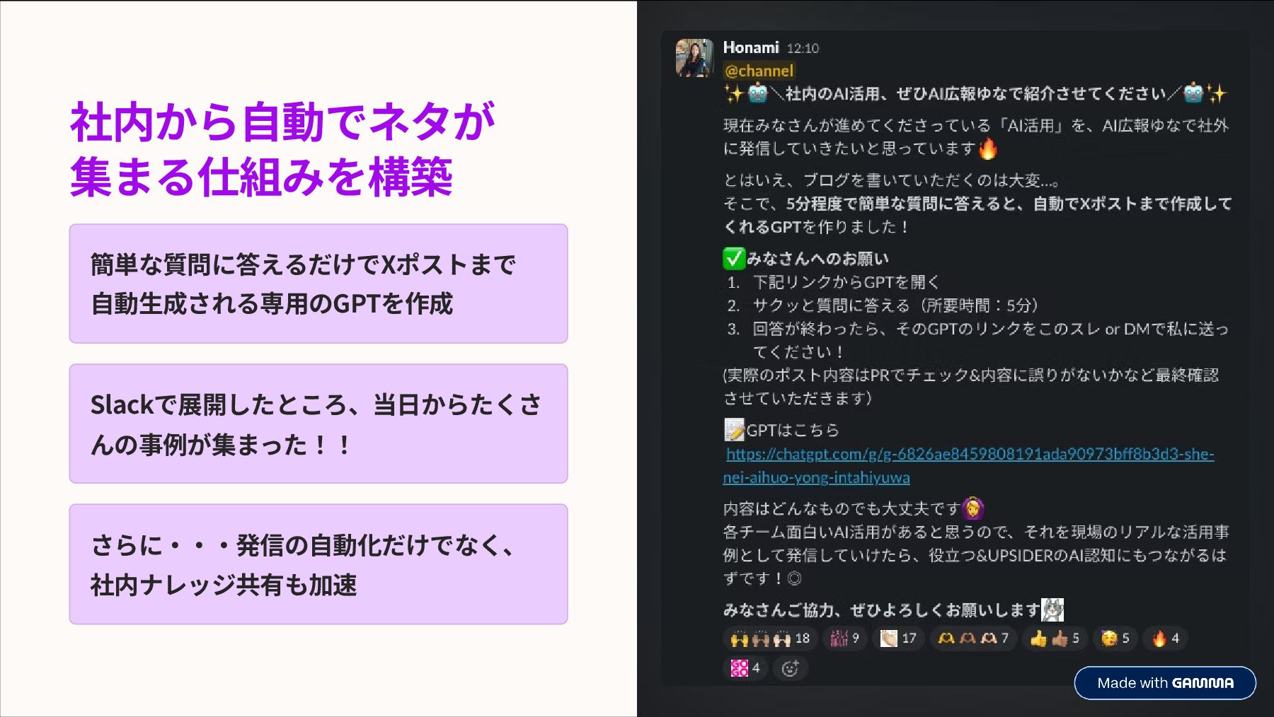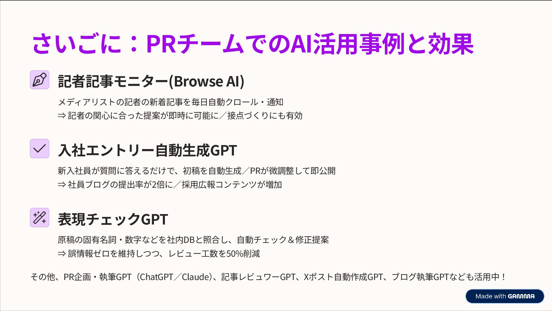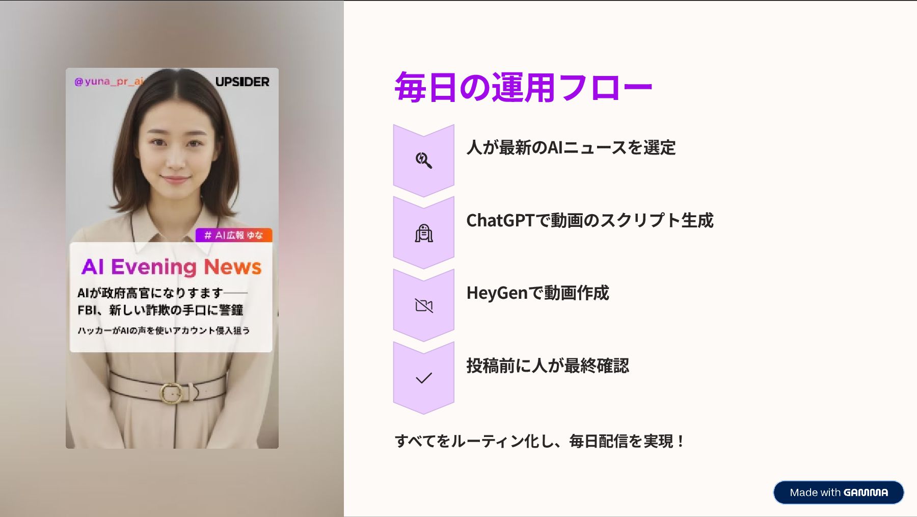 UPSIDER PRチームのAI活用取り組み「AI広報ゆな」についてのスライドです。
