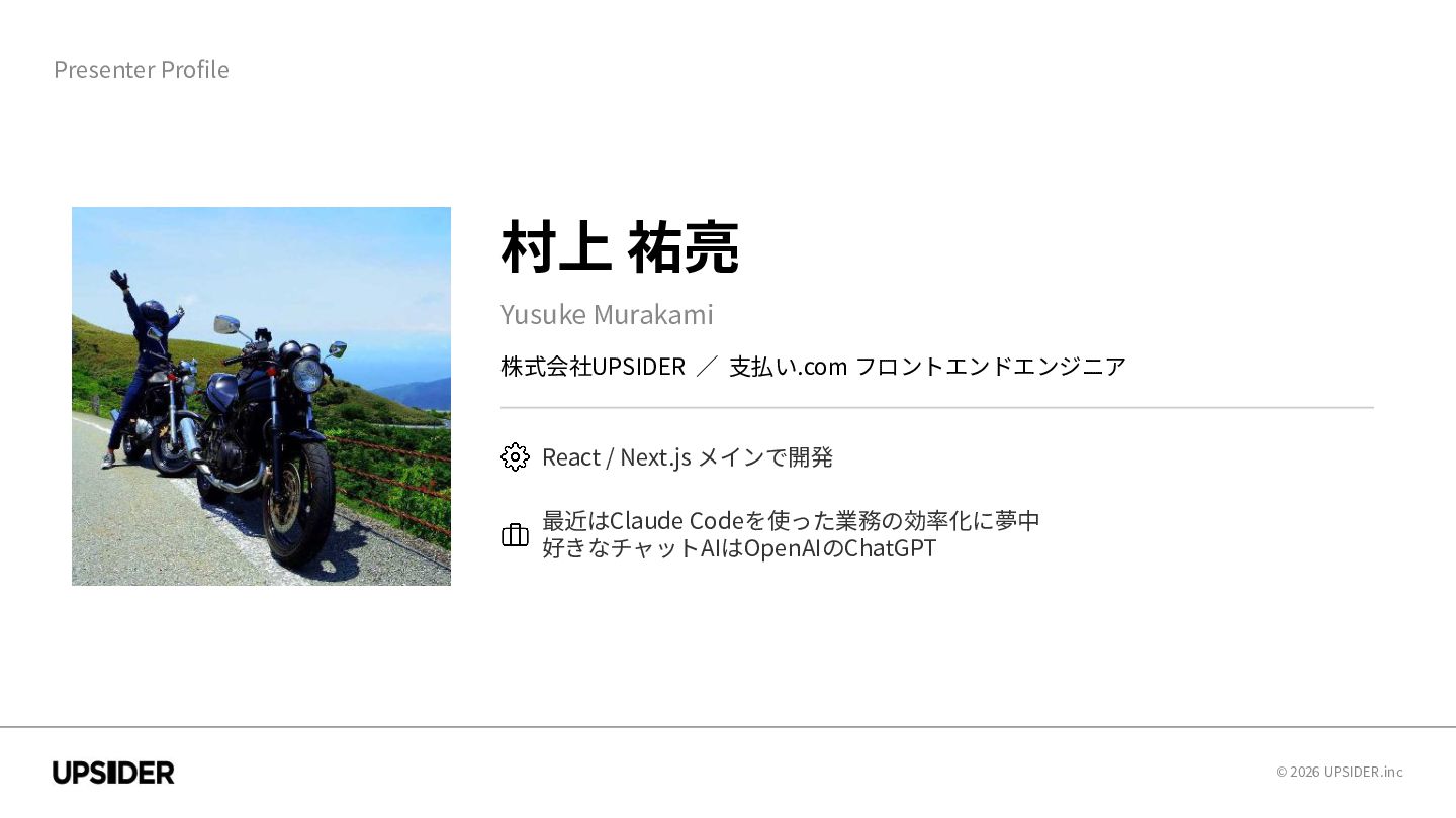 Presenter Profile 村上 祐亮 Yusuke Murakami 株式会社UPSIDER ∕ ⽀払い.com フロントエンドエンジニア