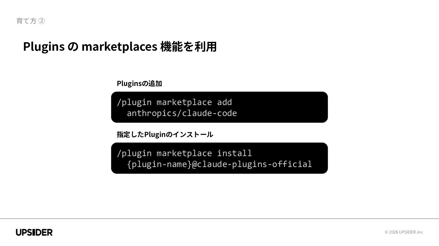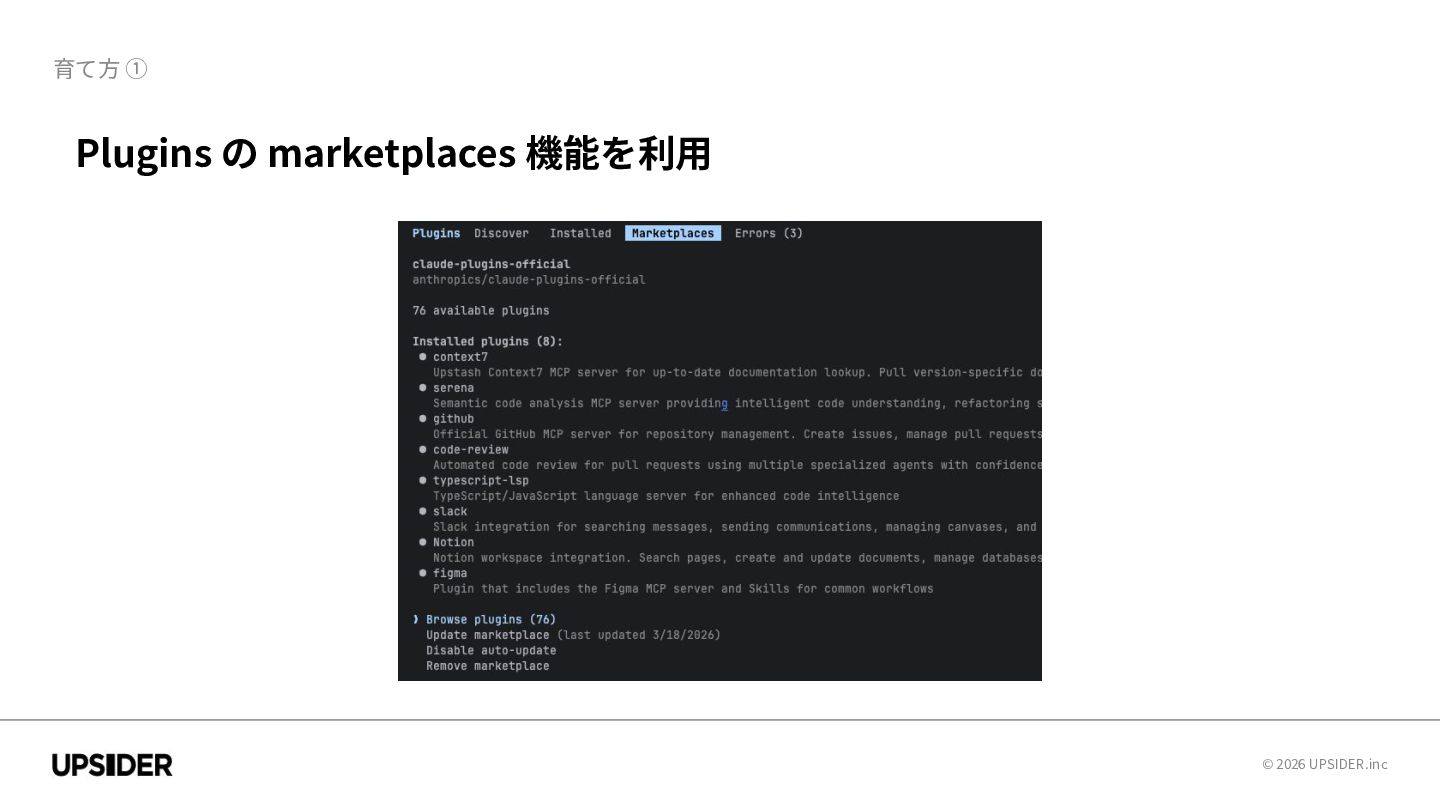 育て⽅ ① Plugins の marketplaces 機能を利⽤ © 2026 UPSIDER.inc