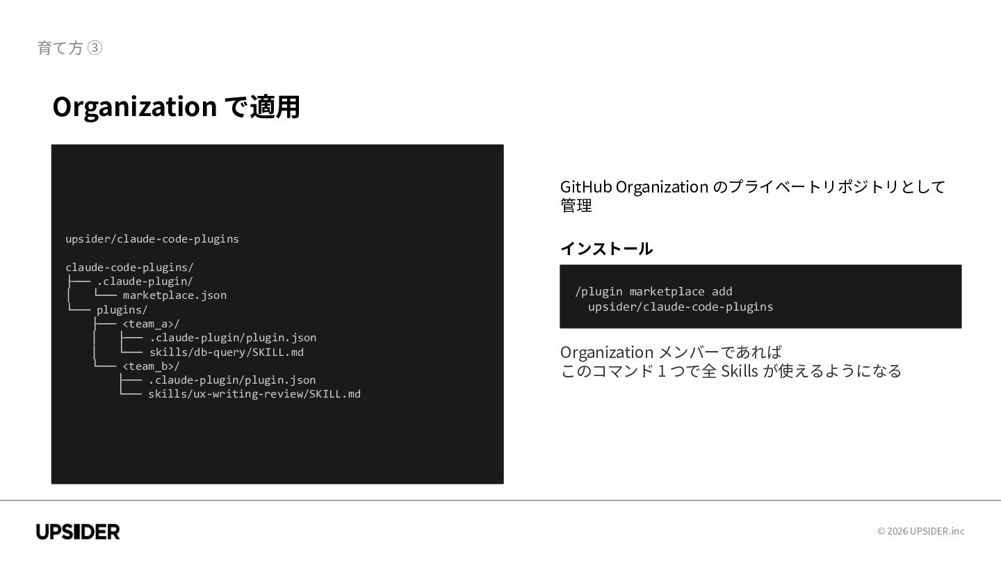 marketplace.json └── plugins/ ├── <team_a>/ │ ├── .claude-plugin/plugin.json │ └── skills/db-query/SKILL.md └── <team_b>/ ├── .claude-plugin/plugin.json └── skills/ux-writing-review/SKILL.md GitHub Organization のプライベートリポジトリとして 管理 インストール /plugin marketplace add upsider/claude-code-plugins © 2026 UPSIDER.inc Organization メンバーであれば このコマンド 1 つで全 Skills が使えるようになる