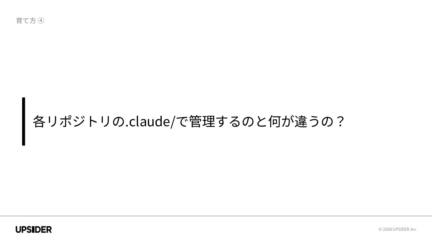 育て⽅ ④ 各リポジトリの.claude/で管理するのと何が違うの? © 2026 UPSIDER.inc