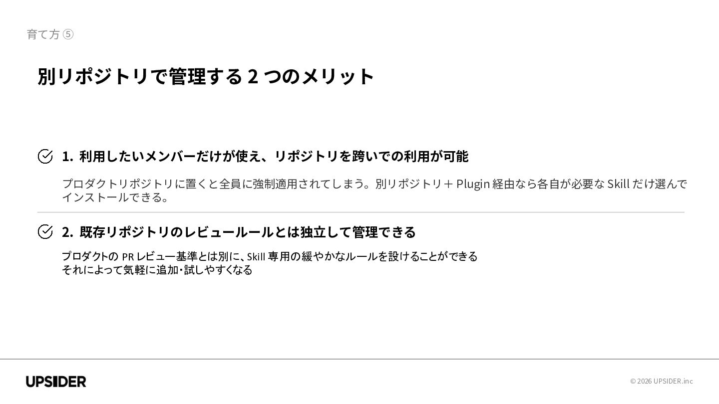 Skill だけ選んで インストールできる。 2. 既存リポジトリのレビュールールとは独⽴して管理できる プロダクトの PR レビュー基準とは別に、Skill 専用の緩やかなルールを設けることができる それによって気軽に追加・試しやすくなる © 2026 UPSIDER.inc