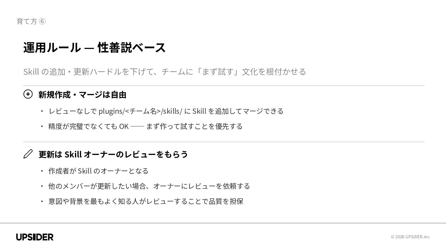 plugins/<チーム名>/skills/ に Skill を追加してマージできる ‧ 精度が完璧でなくても OK ── まず作って試すことを優先する 更新は Skill オーナーのレビューをもらう ‧ 作成者が Skill のオーナーとなる ‧ 他のメンバーが更新したい場合、オーナーにレビューを依頼する ‧ 意図や背景を最もよく知る⼈がレビューすることで品質を担保 © 2026 UPSIDER.inc