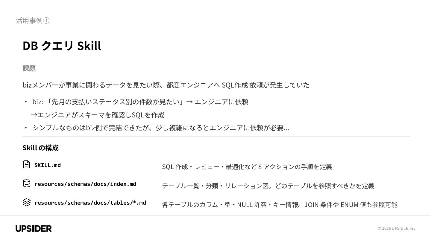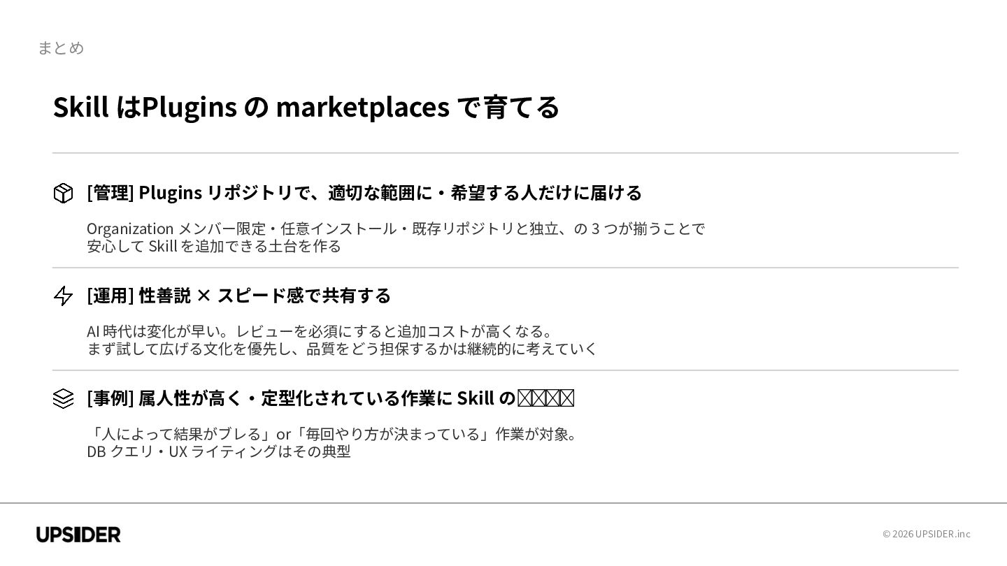 メンバー限定‧任意インストール‧既存リポジトリと独⽴、の 3 つが揃うことで 安⼼して Skill を追加できる⼟台を作る [運⽤] 性善説 × スピード感で共有する AI 時代は変化が早い。レビューを必須にすると追加コストが⾼くなる。 まず試して広げる⽂化を優先し、品質をどう担保するかは継続的に考えていく [事例] 属⼈性が⾼く‧定型化されている作業に Skill の余地がある 「⼈によって結果がブレる」or「毎回やり⽅が決まっている」作業が対象。 DB クエリ‧UX ライティングはその典型 © 2026 UPSIDER.inc