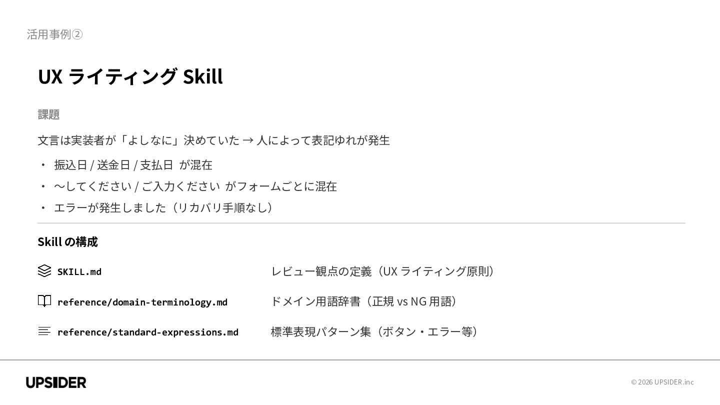 / 送⾦⽇ / ⽀払⽇ が混在 ‧ 〜してください / ご⼊⼒ください がフォームごとに混在 ‧ エラーが発⽣しました(リカバリ⼿順なし) Skill の構成 SKILL.md レビュー観点の定義(UX ライティング原則) reference/domain-terminology.md ドメイン⽤語辞書(正規 vs NG ⽤語) reference/standard-expressions.md 標準表現パターン集(ボタン‧エラー等) © 2026 UPSIDER.inc