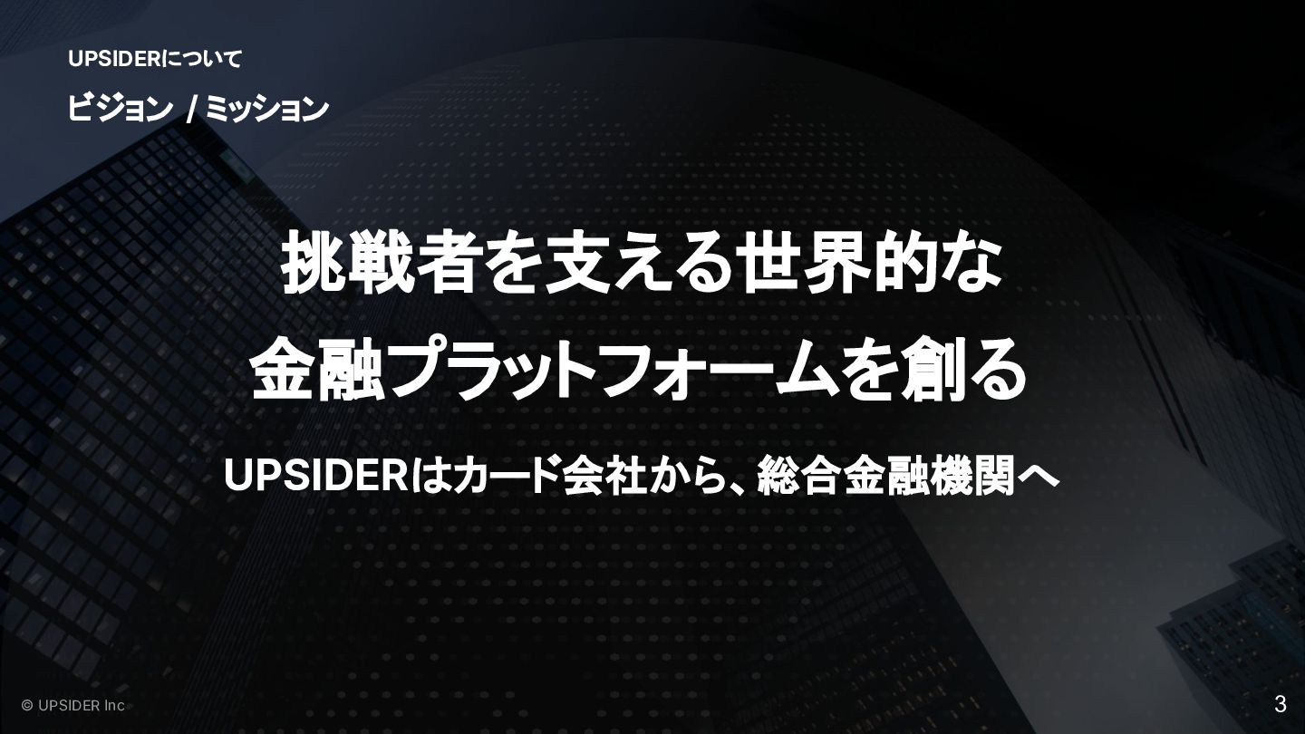 挑戦者を支える世界的な 金融プラットフォームを創る UPSIDERはカード会社から、総合金融機関へ UPSIDERについて ビジョン / ミッション 3 © UPSIDER