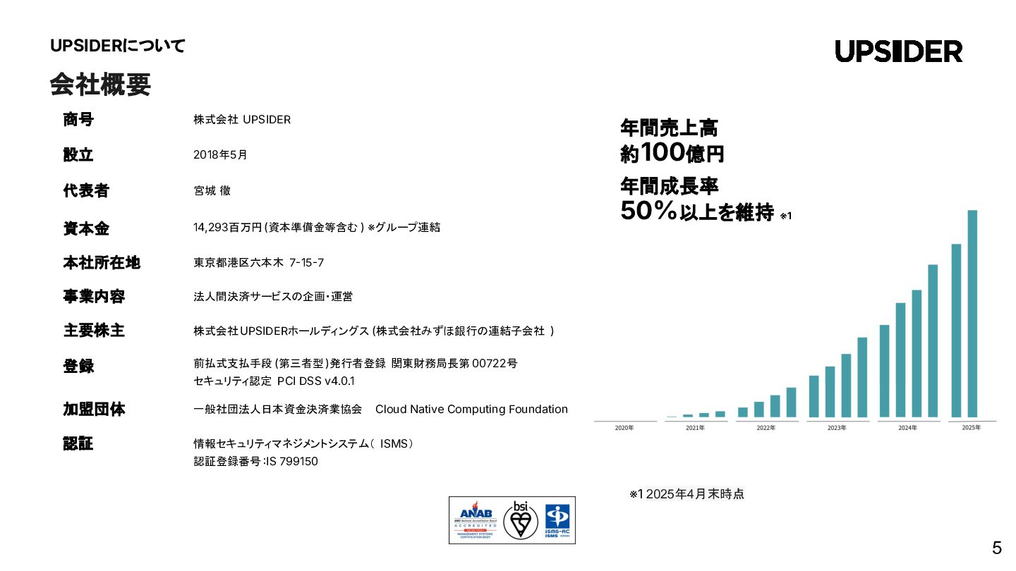 株式会社 UPSIDER 2018年5月 宮城 徹 14,293百万円(資本準備金等含む ) ※グループ連結 東京都港区六本木 7157 一般社団法人日本資金決済業協会 Cloud Native Computing Foundation 前払式支払手段 (第三者型)発行者登録 関東財務局長第 00722号 セキュリティ認定 PCI DSS v4.0.1 株式会社UPSIDERホールディングス (株式会社みずほ銀行の連結子会社 ) 事業内容 法人間決済サービスの企画・運営 5 認証 情報セキュリティマネジメントシステム( ISMS) 認証登録番号 IS 799150 年間売上高 約100億円 年間成長率 50%以上を維持 ※1 ※1 2025年4月末時点