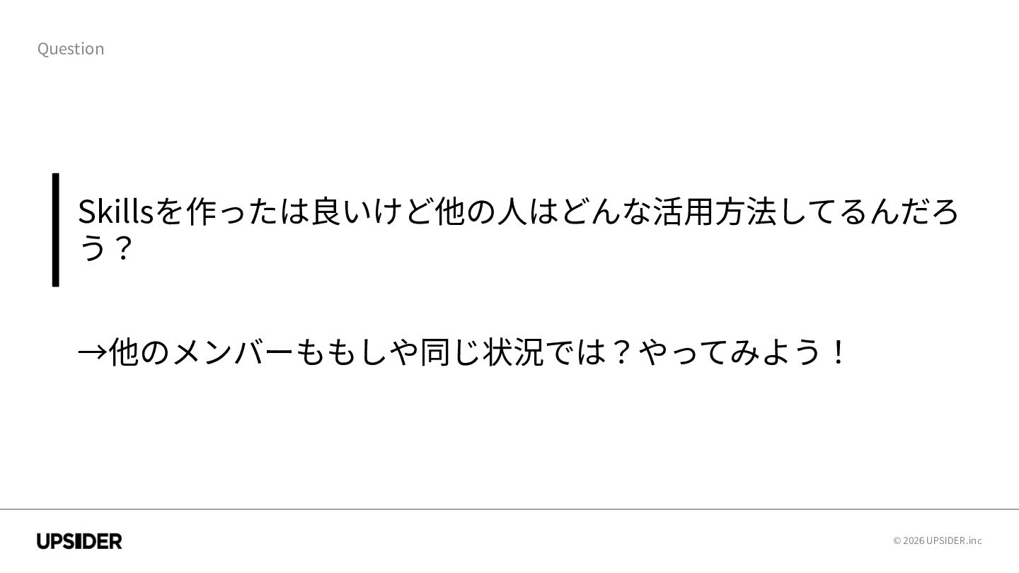 Question Skillsを作ったは良いけど他の⼈はどんな活⽤⽅法してるんだろ う? © 2026 UPSIDER.inc