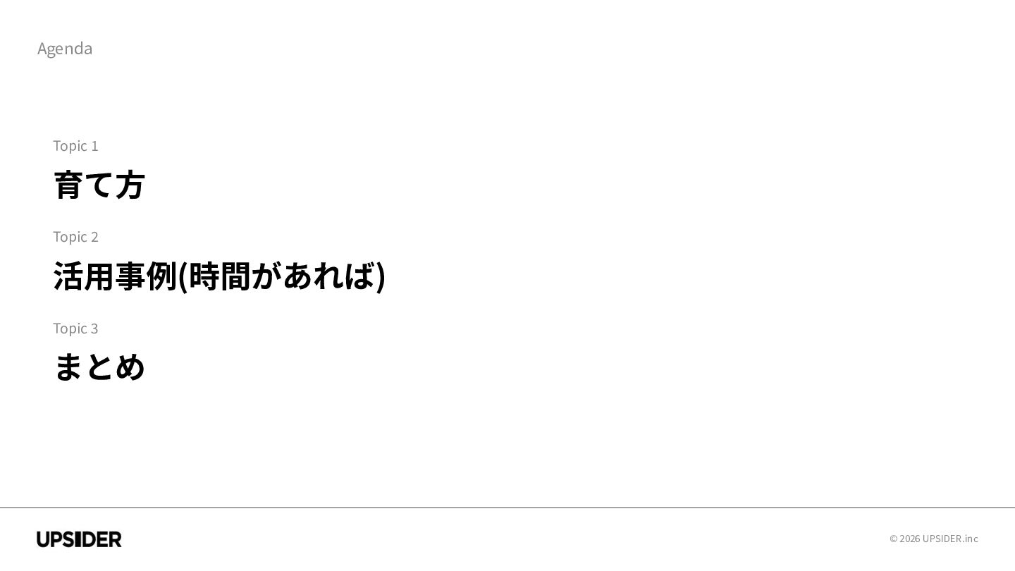 Agenda Topic 1 育て⽅ Topic 2 活⽤事例(時間があれば) Topic 3 まとめ