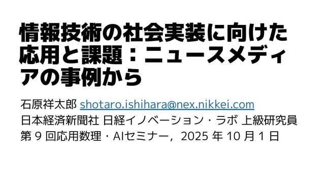 [6] 編集:記者を支援する枠組みを模索 20 [4] 石原祥太郎, 村田栄樹, 中間康文, 高橋寛武 (2024). 日本語ニュース記事要約支援に向けたドメイ ン特化事前学習済みモデルの構築と活用. 自然言語処理. [5] 岩本和真, 大村和正, 石原祥太郎 (2025). 人間が書いた文章を対象としたHallucination検出ベン チマークの構築と評価. 言語処理学会第31回年次大会発表論文集. [6] Kaito Majima, Shotaro Ishihara (2023). Generating News-Centric Crossword Puzzles As A Constraint Satisfaction and Optimization Problem. Proceedings of the CIKM 2023.