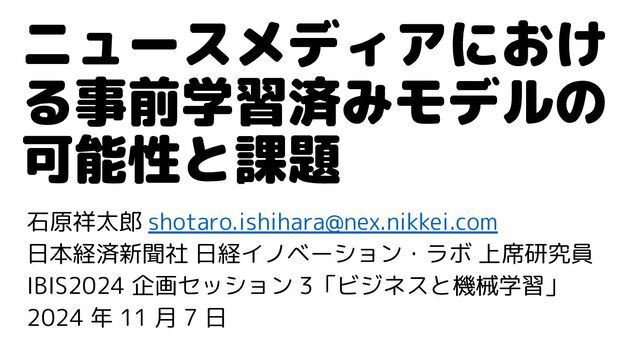 and Detecting Training Data of Pre-trained Language Models using Japanese Newspaper. Proceedings of INLG 2024. • [大村ら23] 大村和正, 白井穂乃, 石原祥太郎, 澤紀彦 (2023). 極性と重要度を考慮した決算短信からの 業績要因文の抽出. 言語処理学会第29回年次大会発表論文集. • [澤田ら24] 澤田悠冶, 安井雄一郎, 大内啓樹, 渡辺太郎, 石井昌之, 石原祥太郎, 山田剛, 進藤裕之 (2024). 企業名の類似度に基づく日経企業IDリンキングシステムの構築と分析. 自然言語処理, 2024, 31巻, 3号. • [Sonoda+24] Atom Sonoda, Fujio Toriumi, and Hiroto Nakajima (2024). User Experiments on the Effect of the Diversity of Consumption on News Services. IEEE Access, vol. 12, pp. 31841-31852. • [白井&石原24] 白井穂乃, 石原祥太郎 (2024). 見出し意味具体化に向けた日本語ベンチマークの構築. 言語処理学会第30回年次大会発表論文集. • [増田ら24] 増田太郎, 石原祥太郎, 吉田勇太 (2022). 企業の業界分類予測における共変量シフト問題の 抑制. 第14回データ工学と情報マネジメントに関するフォーラム. • [高橋ら22] 高橋寛武, 石原祥太郎, 白井穂乃 (2022). 単語分散表現を用いた新型コロナウイルスによる 意味変化検出. 言語処理学会第28回年次大会発表論文集. 71