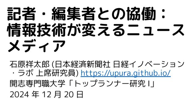 (2022). Generating a Pairwise Dataset for Click-through Rate Prediction of News Articles Considering Positions and Contents. Proceedings of C+J 2022. • [Ishihara&Nakama22b] Shotaro Ishihara and Yasufumi Nakama (2022). Analysis and Estimation of News Article Reading Time with Multimodal Machine Learning. Proceedings of BigData 2022. • [石原ら24a] 石原祥太郎, 村田栄樹, 中間康文, 高橋寛武 (2024). 日本語ニュース記事要約支援に向 たドメイン特化事前学習済みモデルの構築と活用. 自然言語処理, 2024, 31巻, 4号. • [石原ら24b] 石原祥太郎, 高橋寛武, 白井穂乃 (2024). Semantic Shift Stability: 学習コーパス内の単語の 意味変化を用いた事前学習済みモデルの時系列性能劣化の監査. 自然言語処理, 2024, 31巻, 4号. • [大村ら23] 大村和正, 白井穂乃, 石原祥太郎, 澤紀彦 (2023). 極性と重要度を考慮した決算短信からの業 績要因文の抽出. 言語処理学会第29回年次大会発表論文集. • [澤田ら24] 澤田悠冶, 安井雄一郎, 大内啓樹, 渡辺太郎, 石井昌之, 石原祥太郎, 山田剛, 進藤裕之 (2024). 企業名の類似度に基づ 日経企業IDリンキングシステムの構築と分析. 自然言語処理, 2024, 31巻, 3号.