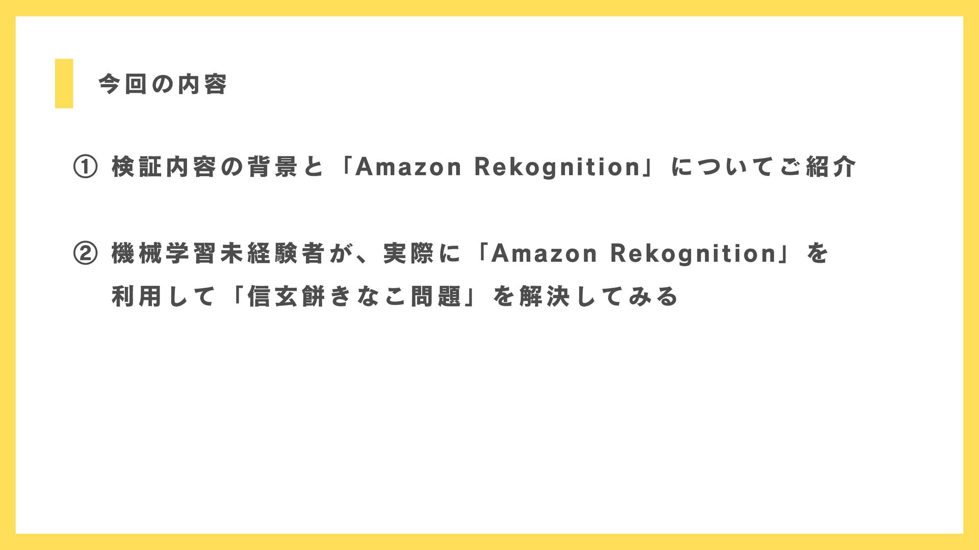 ① 検証内容の背景と「Amazon Rekognition」についてご紹介 ② 機械学習未経験者が、実際に「Amazon Rekognition」を 利用して「信玄餅きなこ問題」を解決してみる 今回の内容
