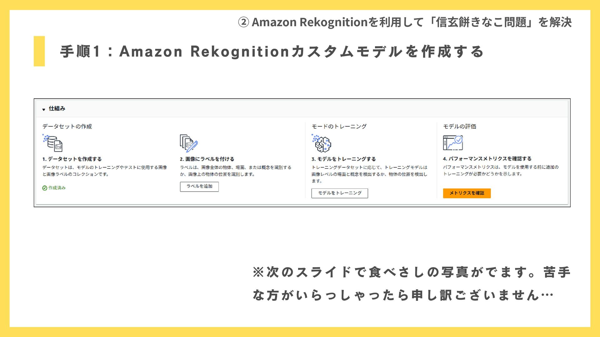 手順1:Amazon Rekognitionカスタムモデルを作成する ② Amazon Rekognitionを利用して「信玄餅きなこ問題」を解決 ※次のスライドで食べさしの写真がでます。苦手 な方がいらっしゃったら申し訳ございません…