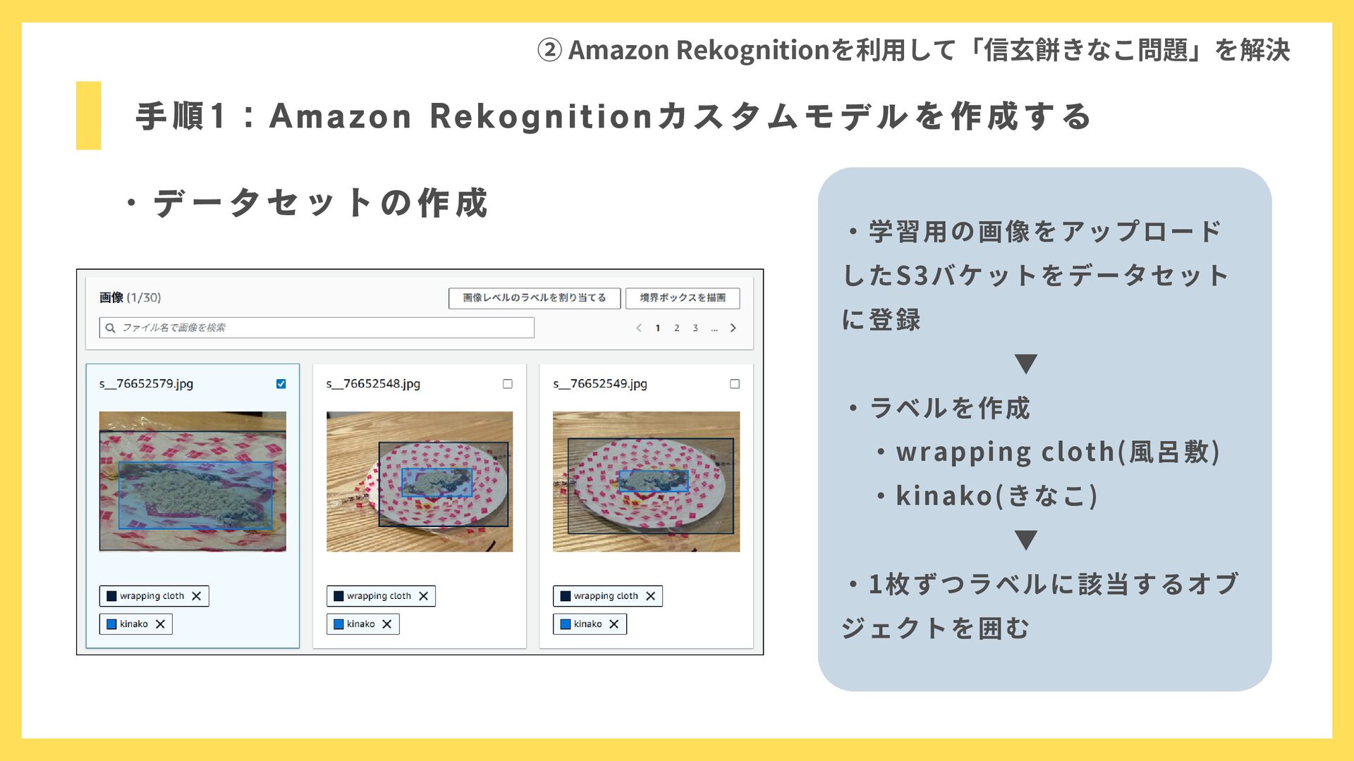 手順1:Amazon Rekognitionカスタムモデルを作成する ② Amazon Rekognitionを利用して「信玄餅きなこ問題」を解決 ・データセットの作成 ・学習用の画像をアップロード したS3バケットをデータセット に登録
