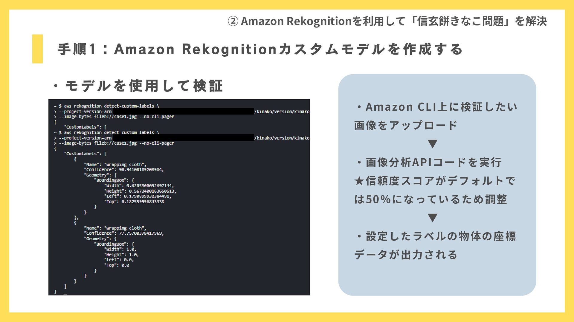 手順1:Amazon Rekognitionカスタムモデルを作成する ② Amazon Rekognitionを利用して「信玄餅きなこ問題」を解決 ・モデルを使用して検証 ・Amazon CLI上に検証したい 画像をアップロード