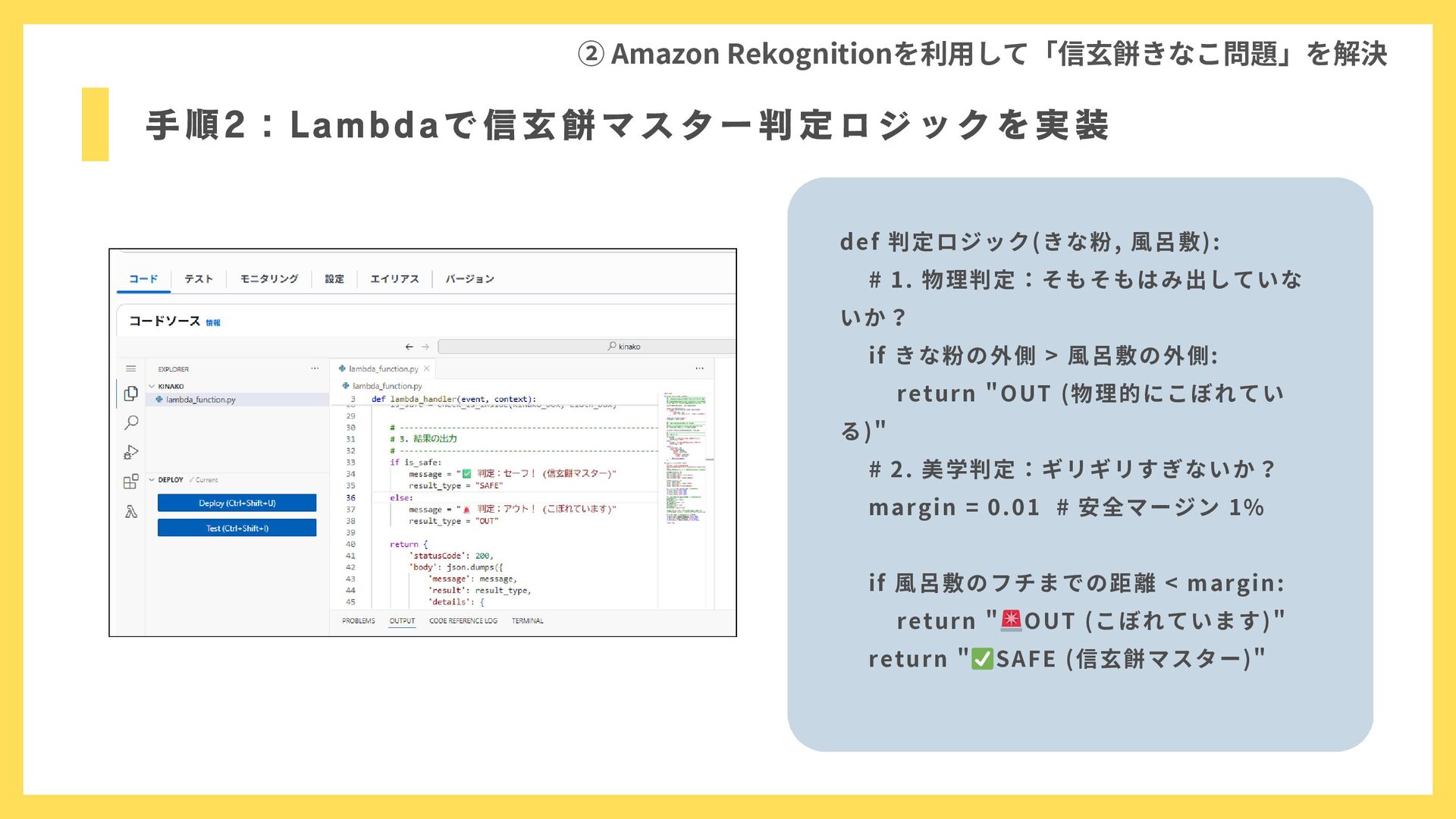 手順2:Lambdaで信玄餅マスター判定ロジックを実装 ② Amazon Rekognitionを利用して「信玄餅きなこ問題」を解決 def 判定ロジック(きな粉, 風呂敷): # 1. 物理判定:そもそもはみ出していな
