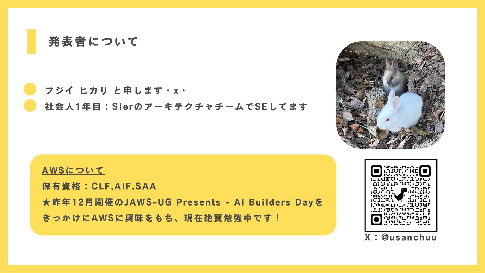 AI Builders Dayを きっかけにAWSに興味をもち、現在絶賛勉強中です! X:@usanchuu