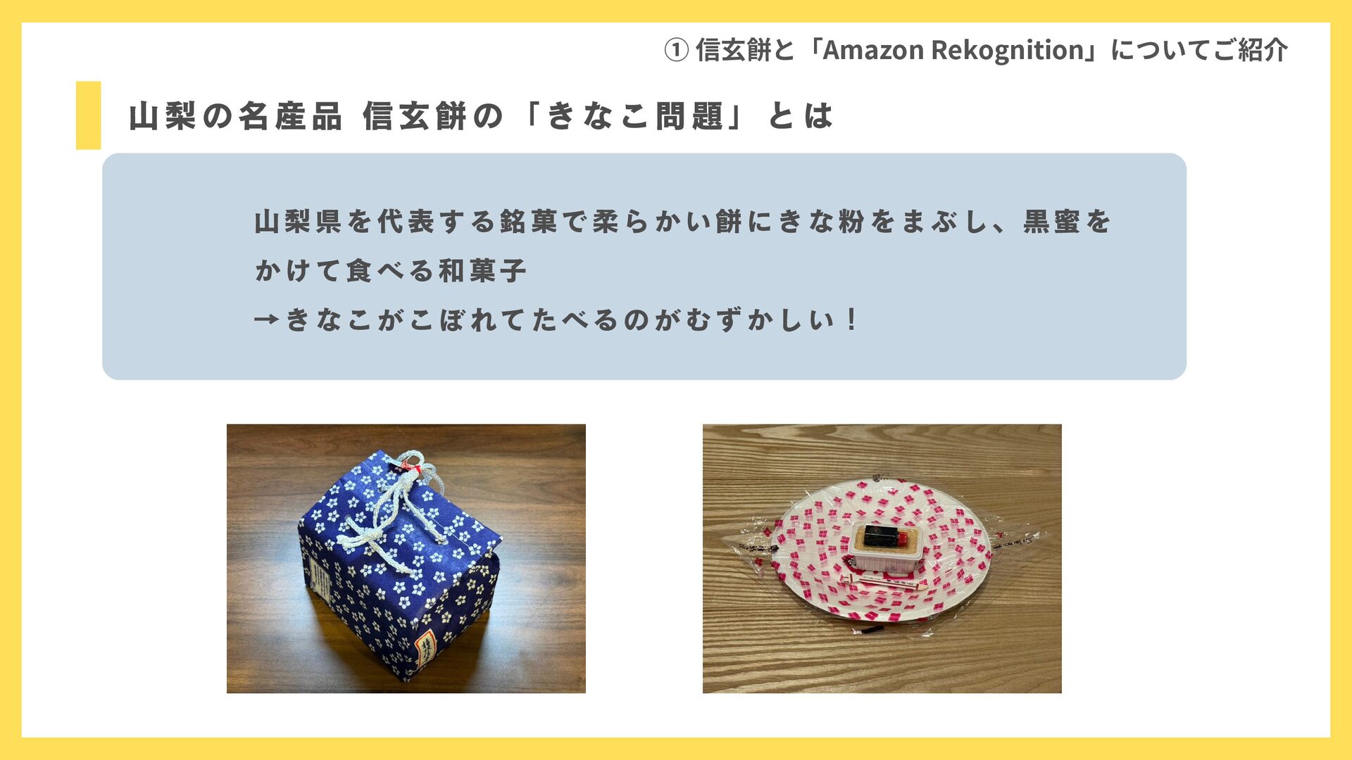山梨県を代表する銘菓で柔らかい餅にきな粉をまぶし、黒蜜を かけて食べる和菓子 →きなこがこぼれてたべるのがむずかしい! 山梨の名産品 信玄餅の「きなこ問題」とは ① 信玄餅と「Amazon Rekognition」についてご紹介