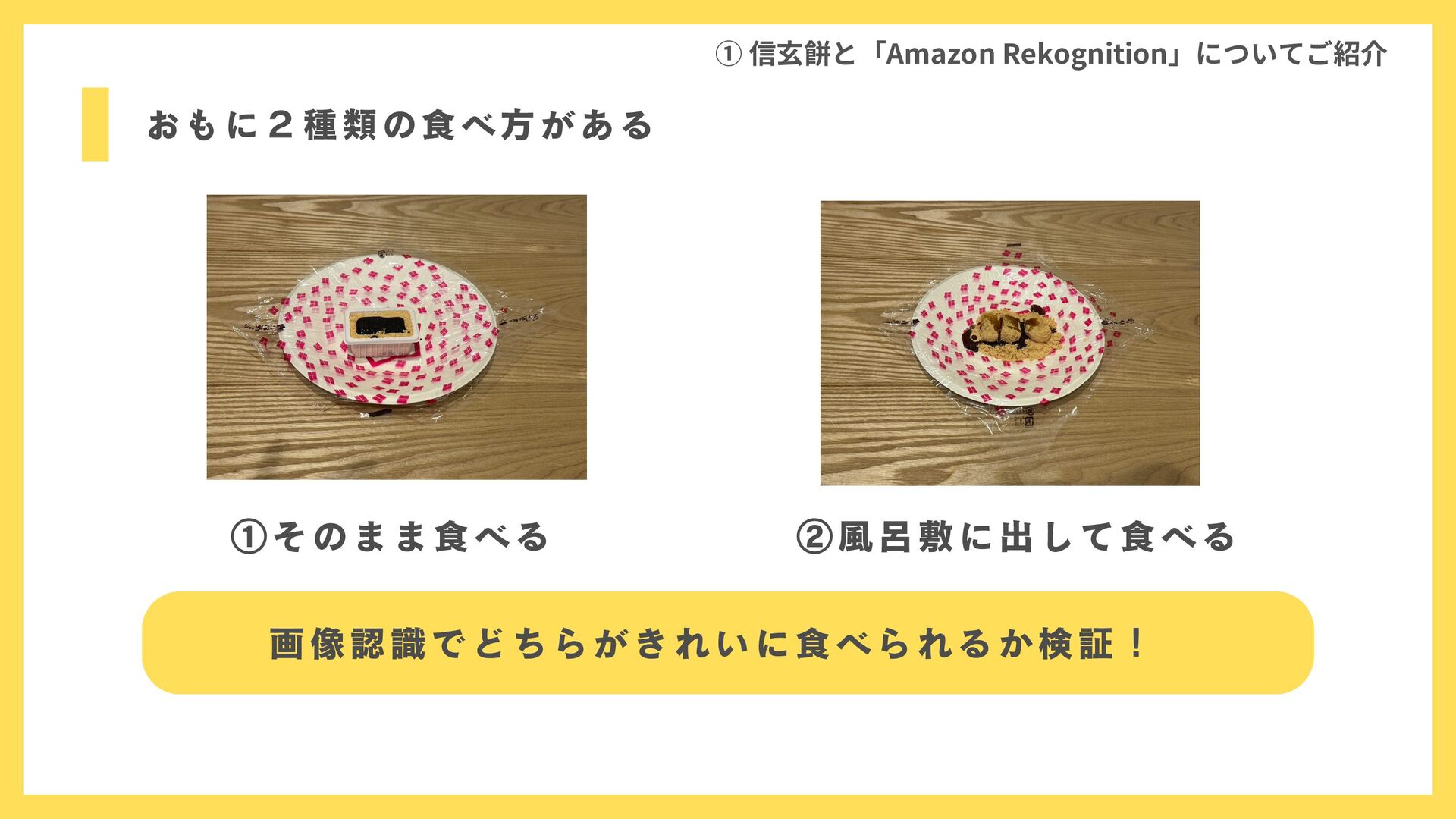 おもに2種類の食べ方がある ① 信玄餅と「Amazon Rekognition」についてご紹介 ②風呂敷に出して食べる ①そのまま食べる 画像認識でどちらがきれいに食べられるか検証!
