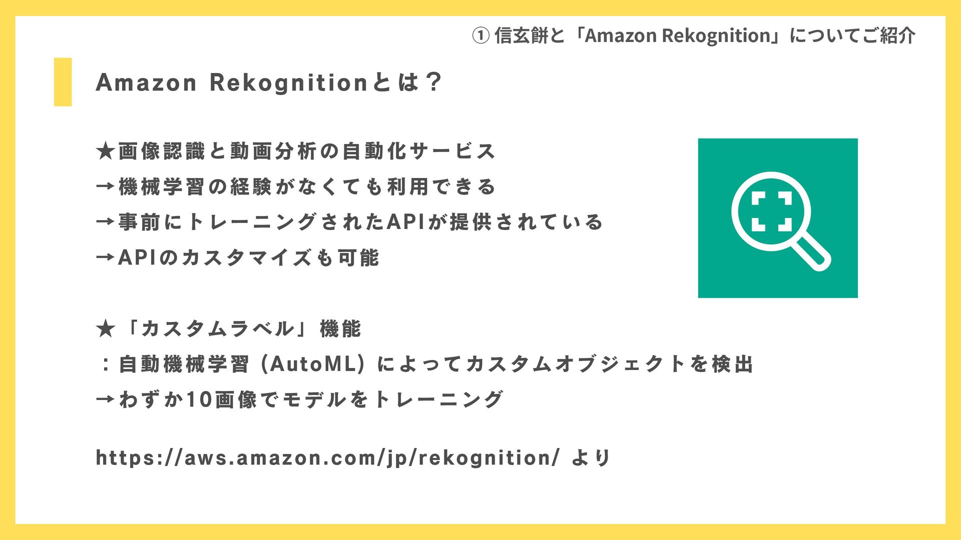 Amazon Rekognitionとは? ① 信玄餅と「Amazon Rekognition」についてご紹介 ★画像認識と動画分析の自動化サービス →機械学習の経験がなくても利用できる →事前にトレーニングされたAPIが提供されている →APIのカスタマイズも可能 ★「カスタムラベル」機能