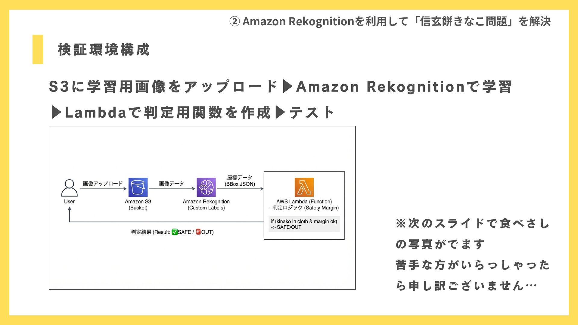 検証環境構成 ② Amazon Rekognitionを利用して「信玄餅きなこ問題」を解決 S3に学習用画像をアップロード▶Amazon Rekognitionで学習 ▶Lambdaで判定用関数を作成▶テスト ※次のスライドで食べさし の写真がでます 苦手な方がいらっしゃった