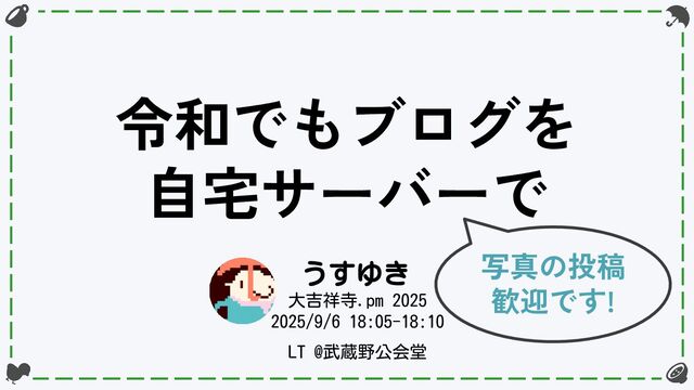 令和でもブログを 自宅サーバーで うすゆき 大吉祥寺.pm 2025 2025/9/6 18:05-18:10 LT @武蔵野公会堂 写真の投稿