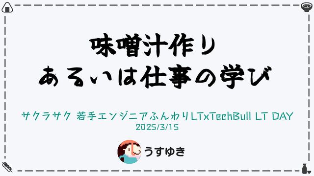 味噌汁作り あるいは仕事の学び サクラサク 若⼿エンジニアふんわりLTxTechBull LT DAY 2025/3/15 うすゆき