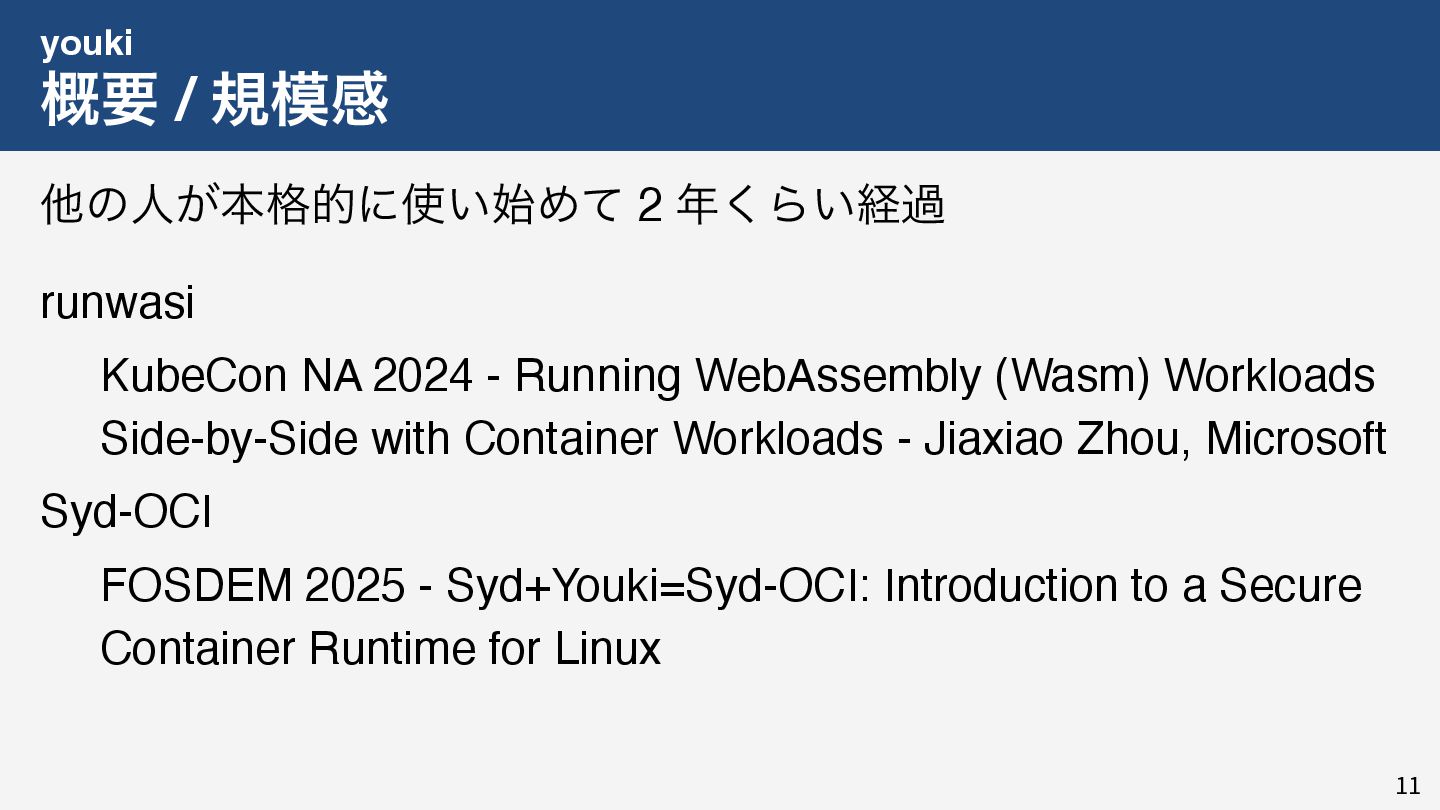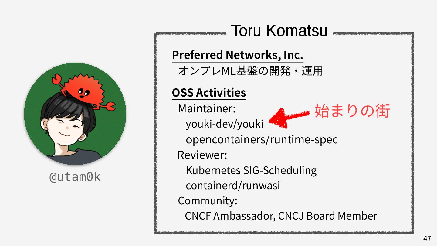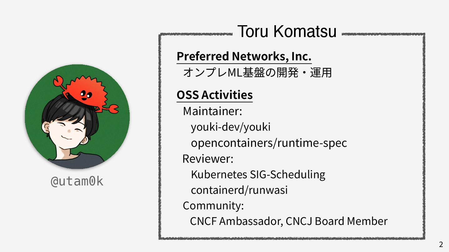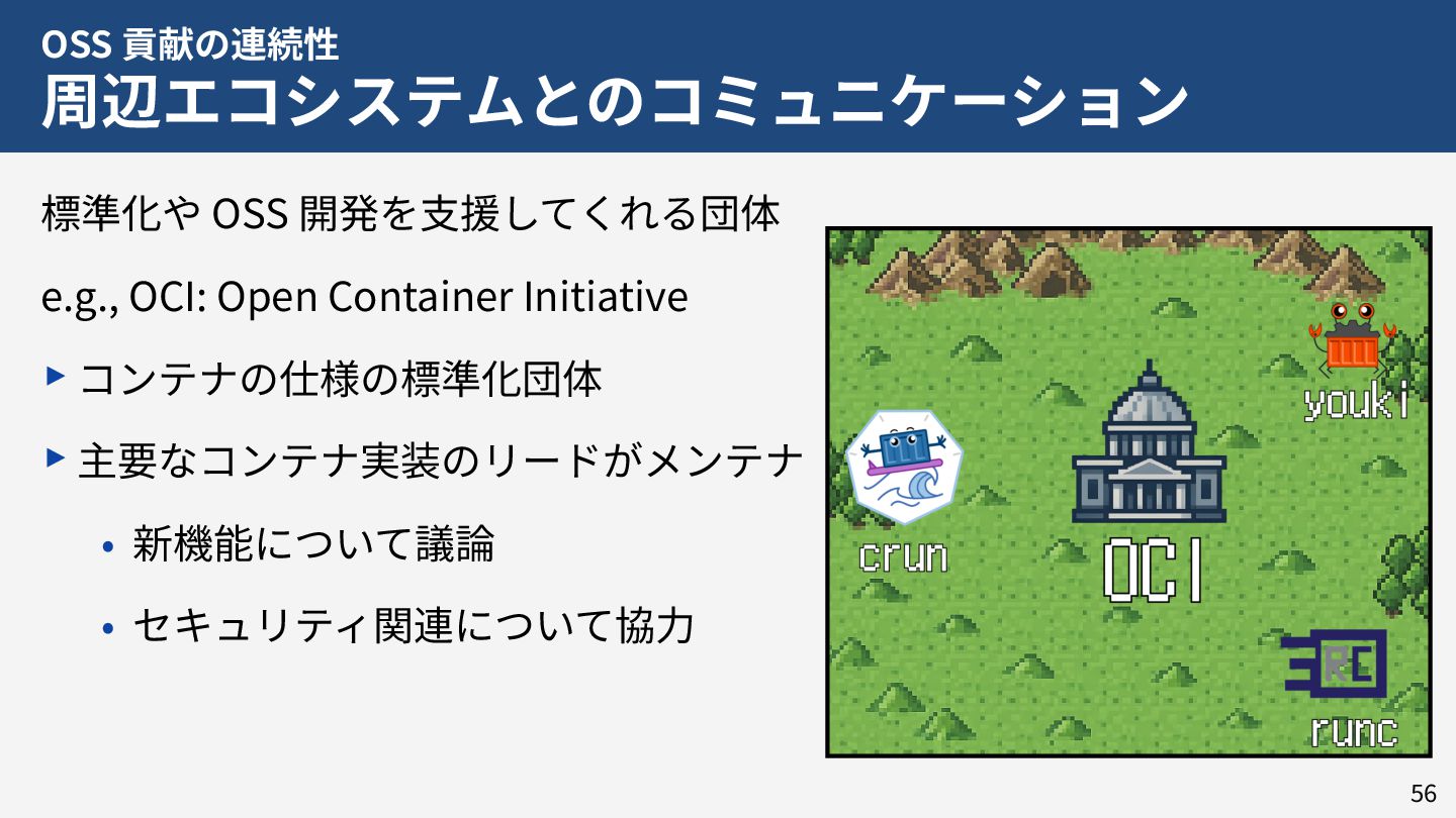 私はこれまで 4 年以上にわたってコンテナランタイム youki の開発をリードしてきました。この 4 年以上のメンテナ経験に基づき、OSS運営の裏側にある課題や意思決定の実際を、具体的な事例と共に解説します。また、一例ではありますが、持続的なOSS運営、つまり常に開発が続き成長をするOSSのために意識してきた観点についても紹介します。本公演を通じて、OSSへの解像度が高まり、効果的な貢献へのイメージを掴んでいただければ幸いです。