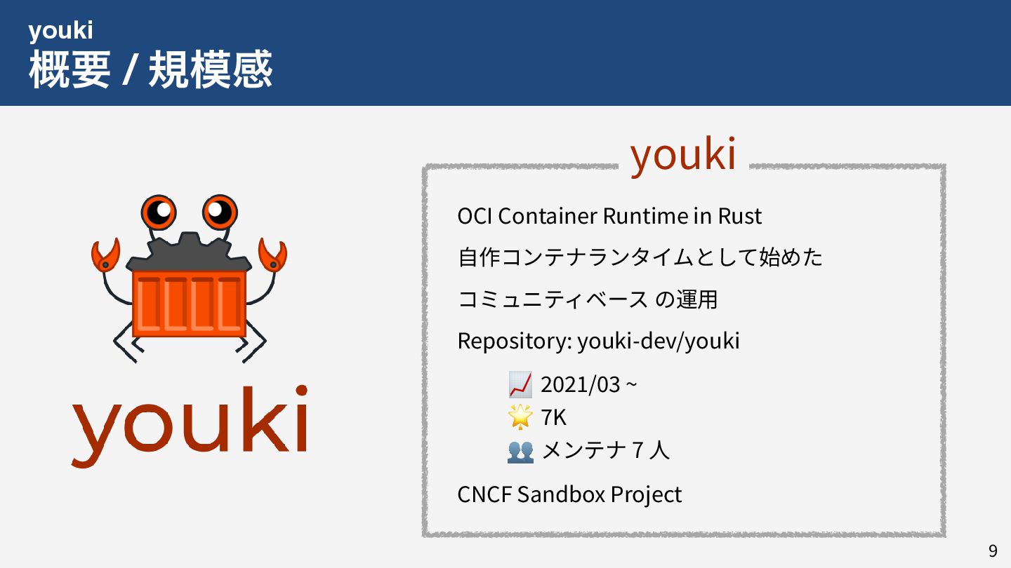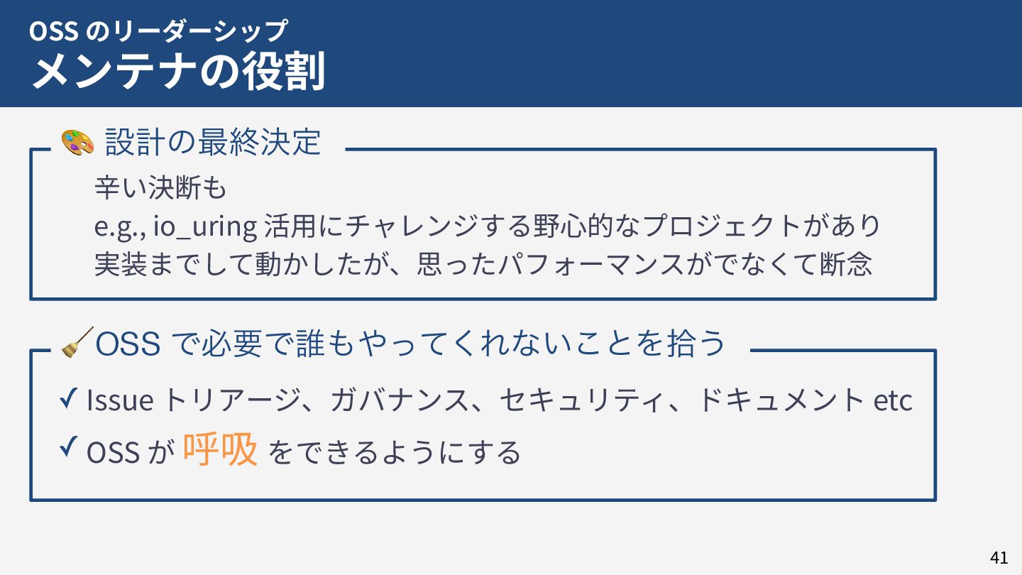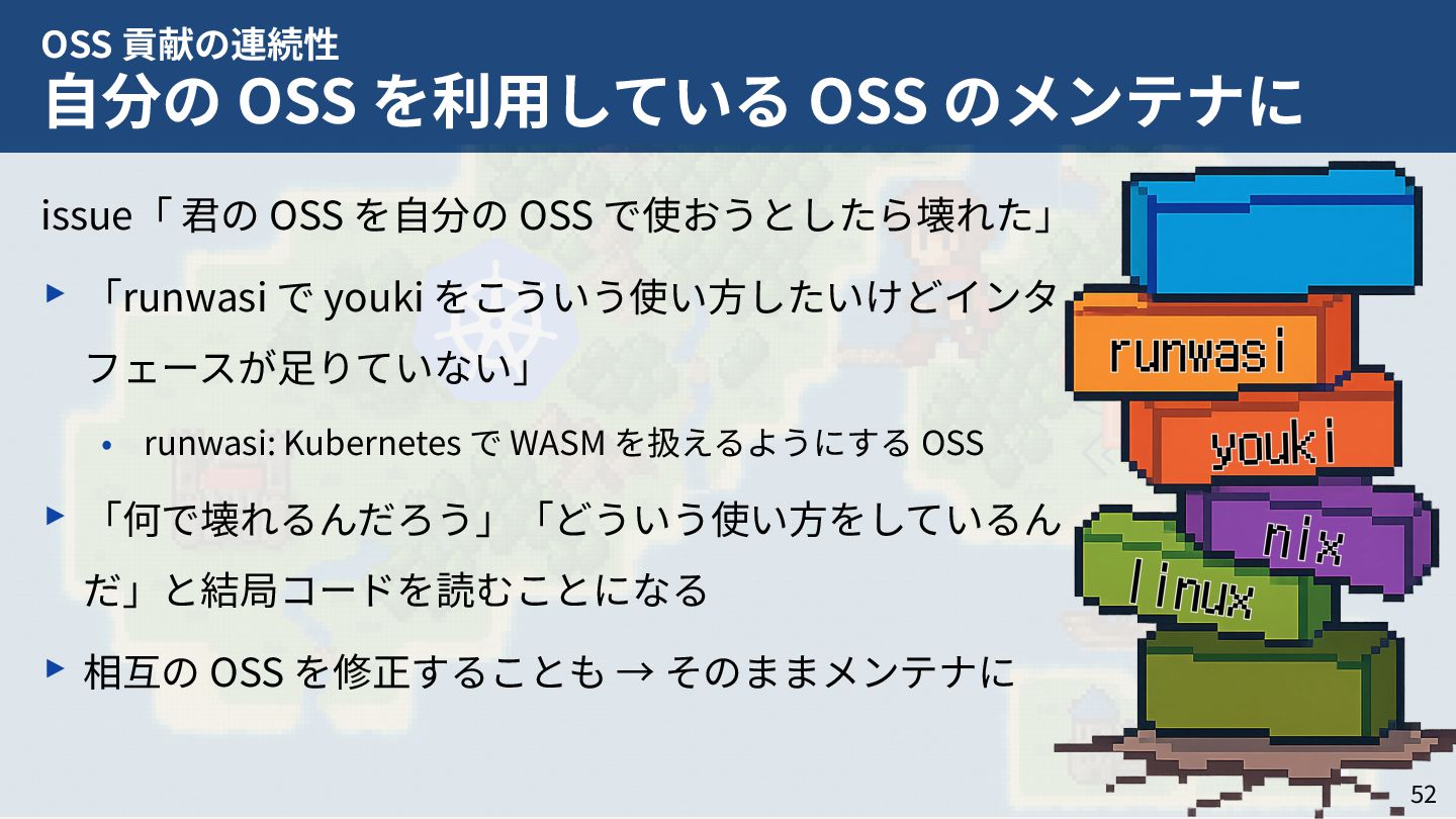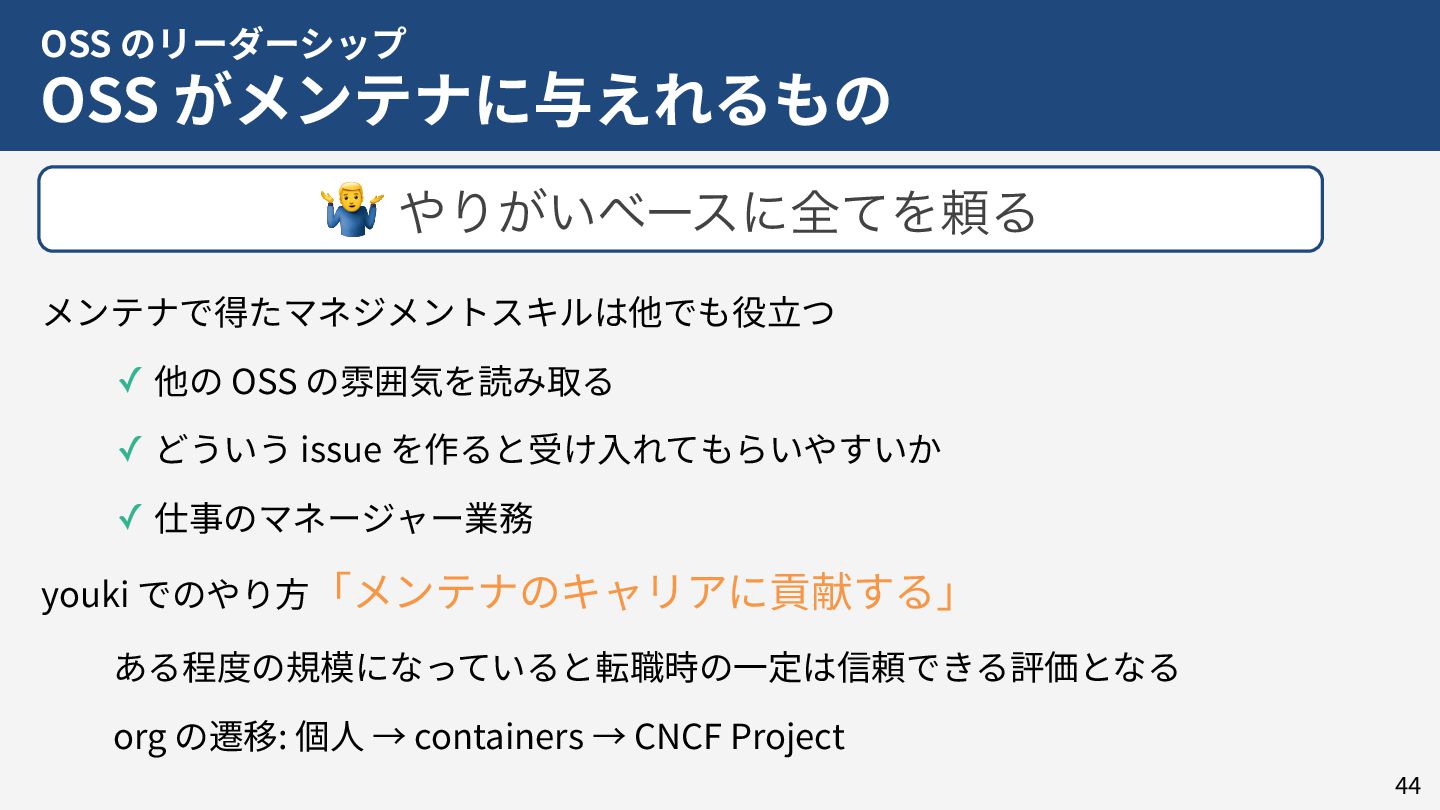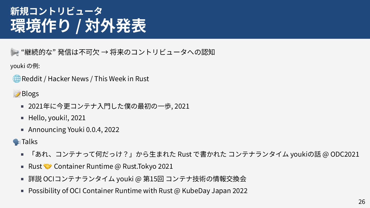 私はこれまで 4 年以上にわたってコンテナランタイム youki の開発をリードしてきました。この 4 年以上のメンテナ経験に基づき、OSS運営の裏側にある課題や意思決定の実際を、具体的な事例と共に解説します。また、一例ではありますが、持続的なOSS運営、つまり常に開発が続き成長をするOSSのために意識してきた観点についても紹介します。本公演を通じて、OSSへの解像度が高まり、効果的な貢献へのイメージを掴んでいただければ幸いです。