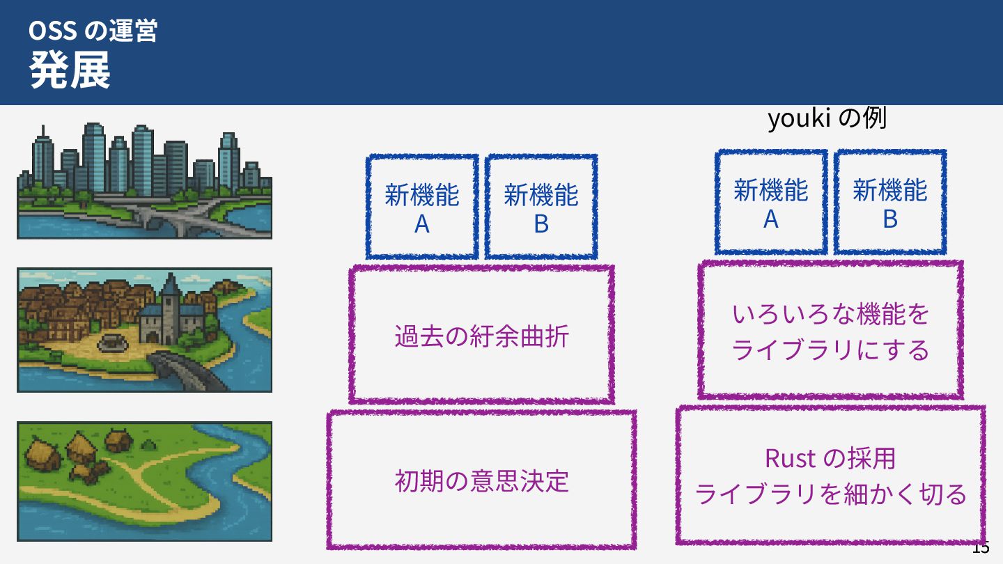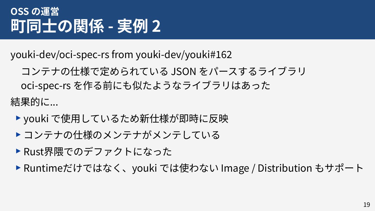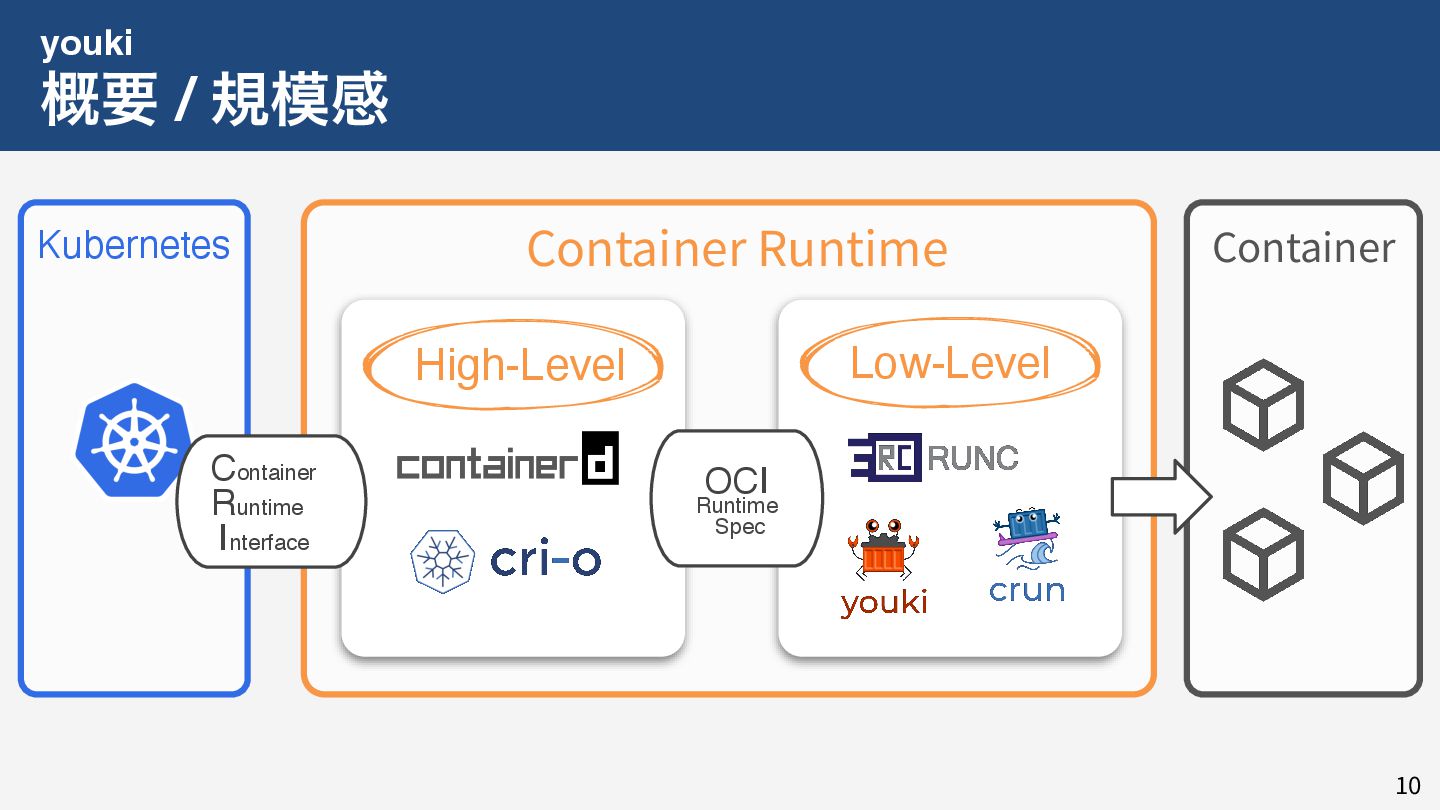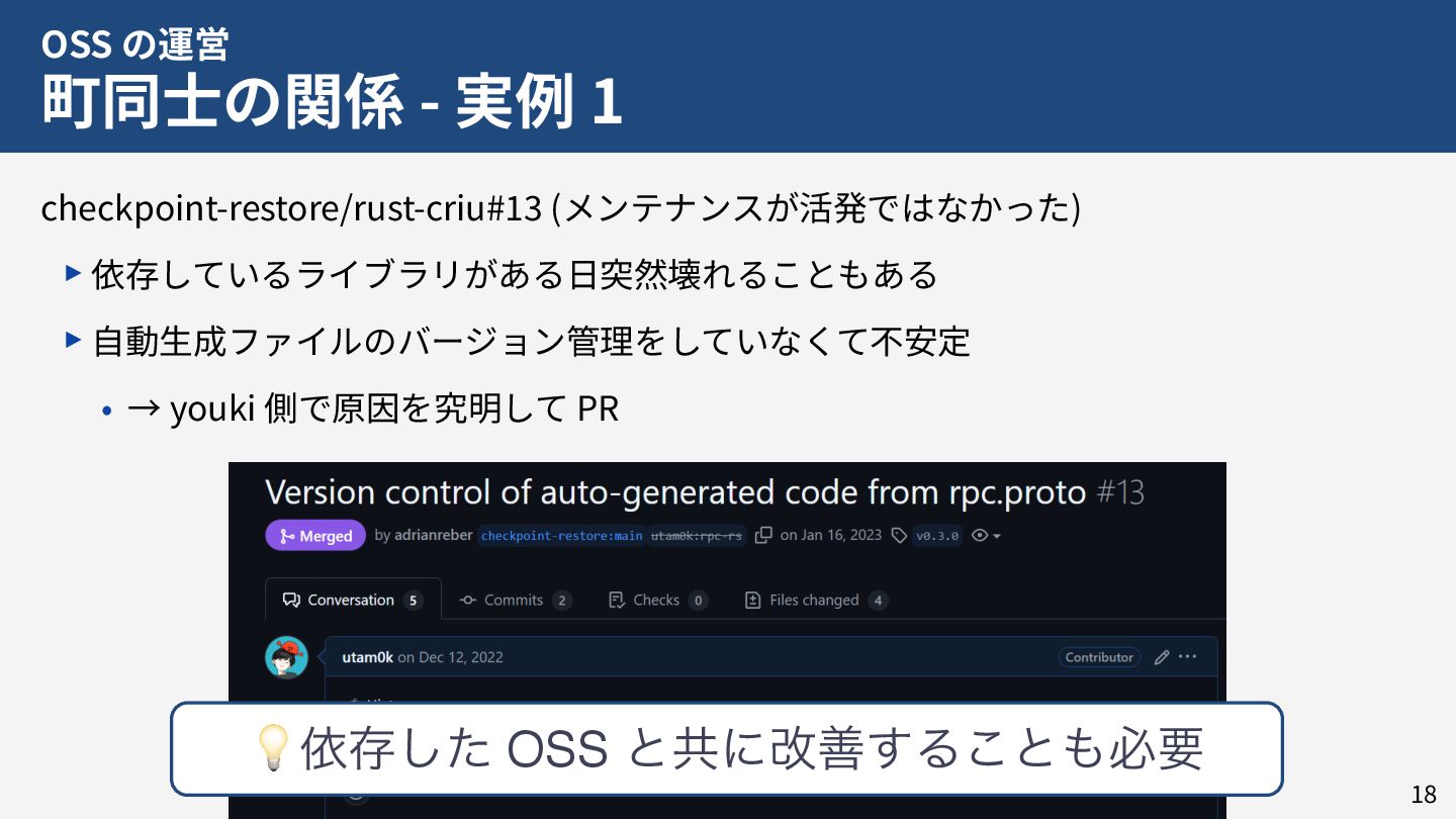 私はこれまで 4 年以上にわたってコンテナランタイム youki の開発をリードしてきました。この 4 年以上のメンテナ経験に基づき、OSS運営の裏側にある課題や意思決定の実際を、具体的な事例と共に解説します。また、一例ではありますが、持続的なOSS運営、つまり常に開発が続き成長をするOSSのために意識してきた観点についても紹介します。本公演を通じて、OSSへの解像度が高まり、効果的な貢献へのイメージを掴んでいただければ幸いです。