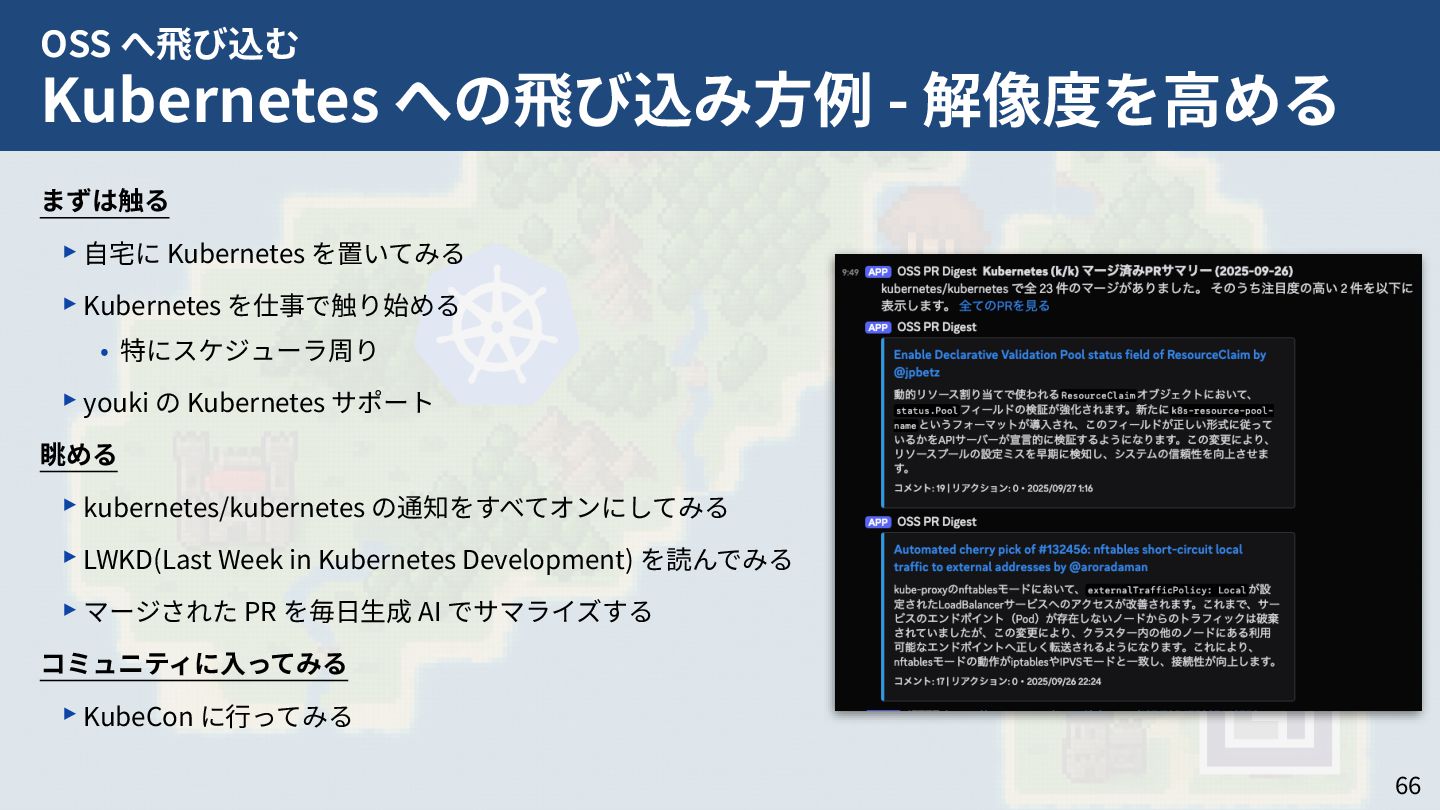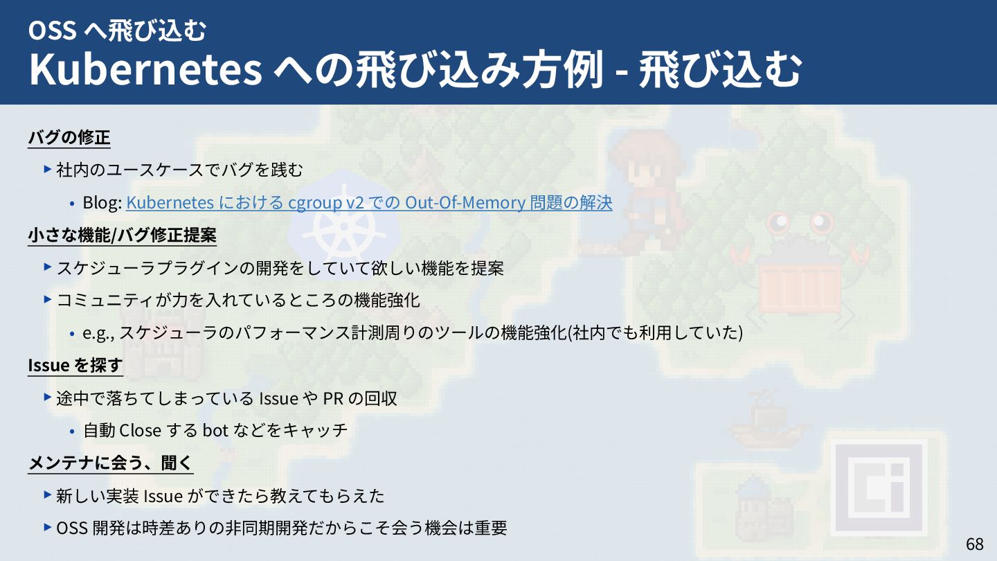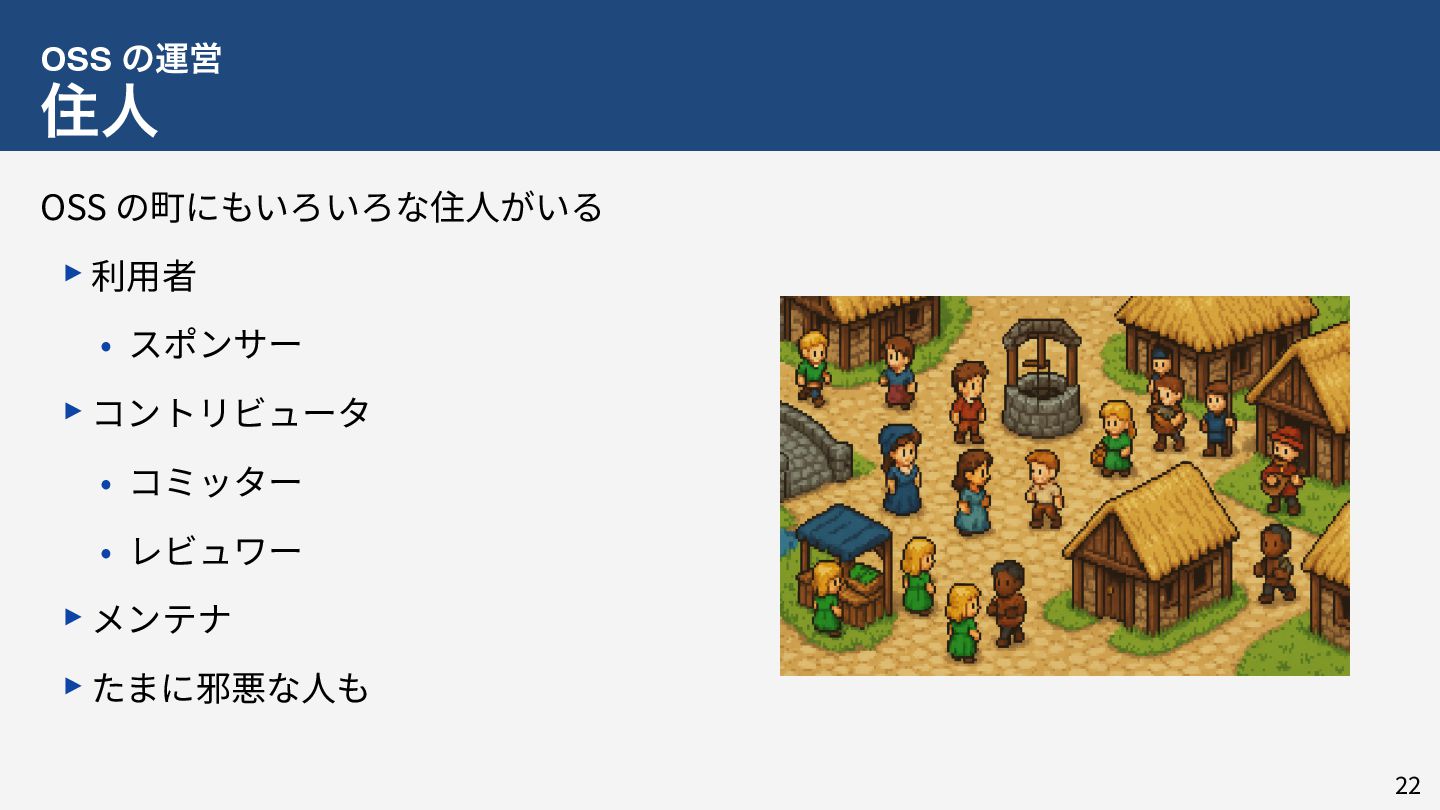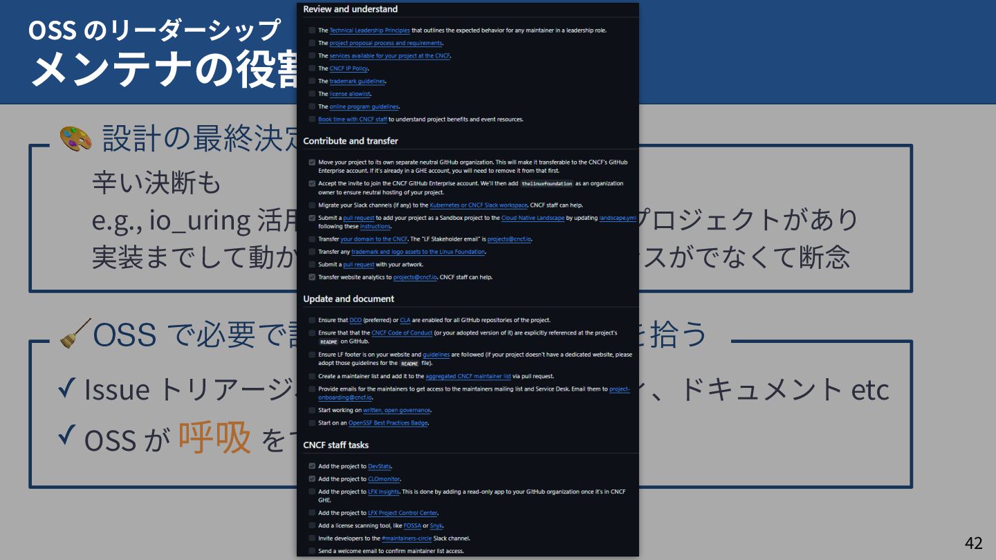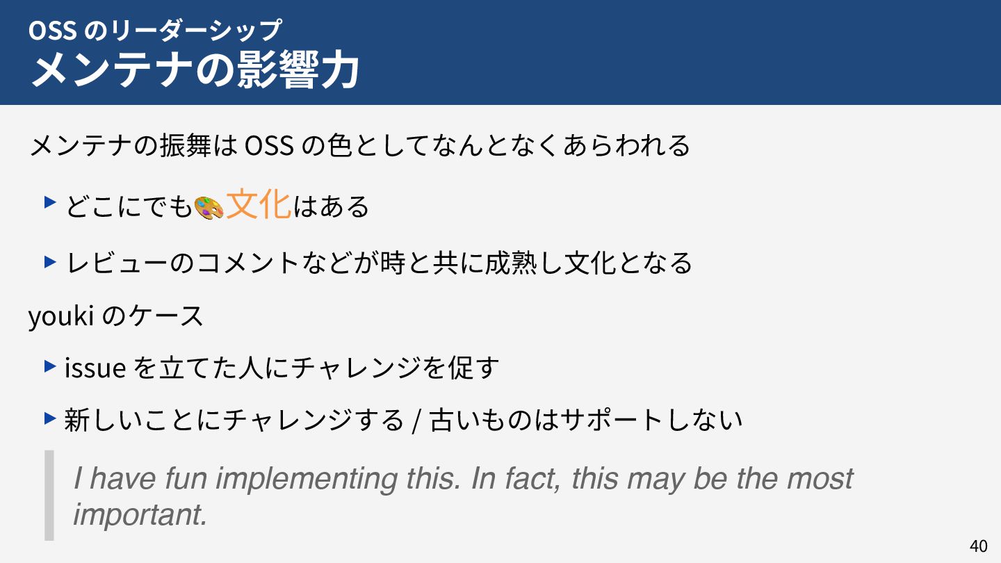 私はこれまで 4 年以上にわたってコンテナランタイム youki の開発をリードしてきました。この 4 年以上のメンテナ経験に基づき、OSS運営の裏側にある課題や意思決定の実際を、具体的な事例と共に解説します。また、一例ではありますが、持続的なOSS運営、つまり常に開発が続き成長をするOSSのために意識してきた観点についても紹介します。本公演を通じて、OSSへの解像度が高まり、効果的な貢献へのイメージを掴んでいただければ幸いです。