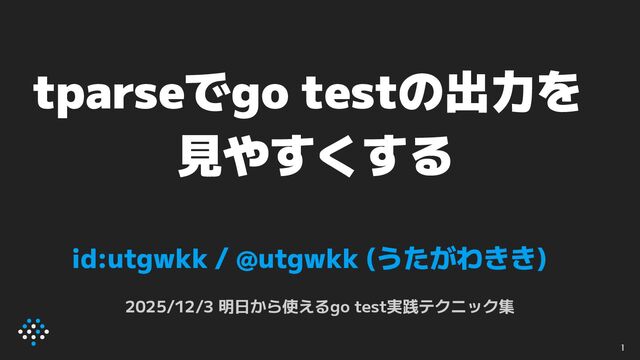 tparseでgo testの出力を 見やすくする id:utgwkk / @utgwkk (うたがわきき) 2025/12/3 明日から使えるgo test実践テクニック集