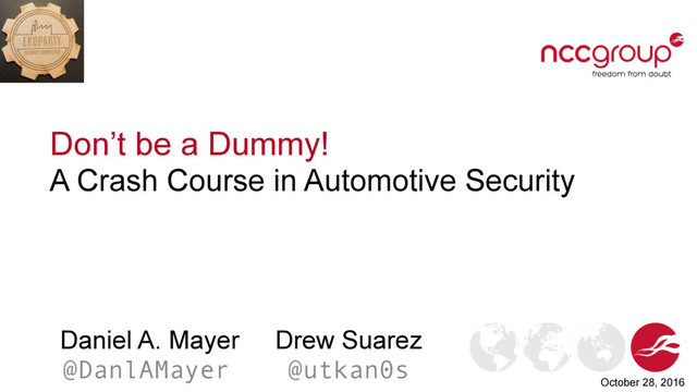Automotive Security Who we are Drew Suarez Principal Security Consultant, Research Director with NCC Group Mobile / Android, IVI, firmware/system updates Daniel Mayer Regional Director with NCC Group Mobile / iOS, Auto threat modeling, IVI and CAN NCC Group UK Headquarters, Worldwide Offices Security Consulting, Software Escrow, Domain Services 7